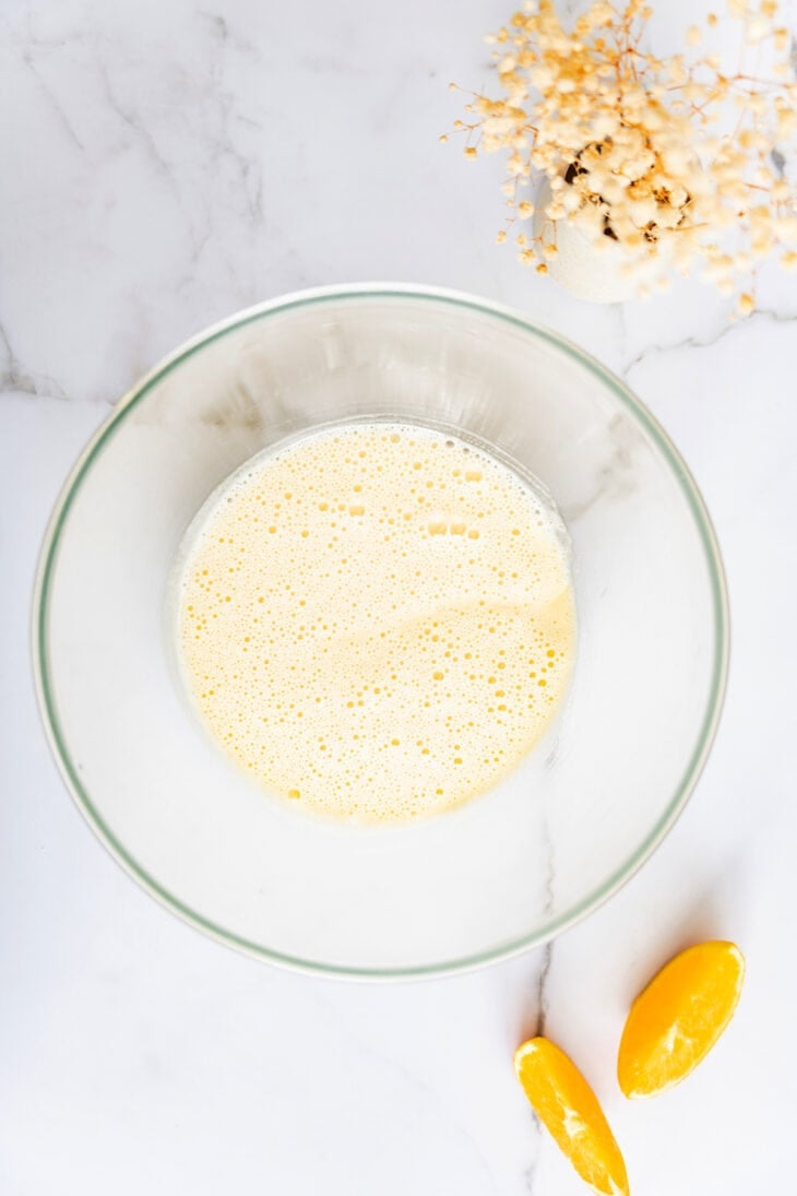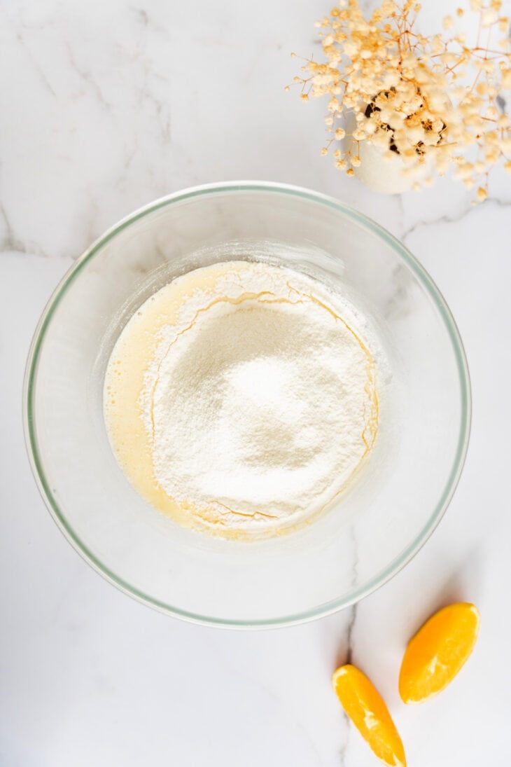 • Now add the melted (and slightly cooled) melted butter, orange juice and zest, and mix until incorporated.