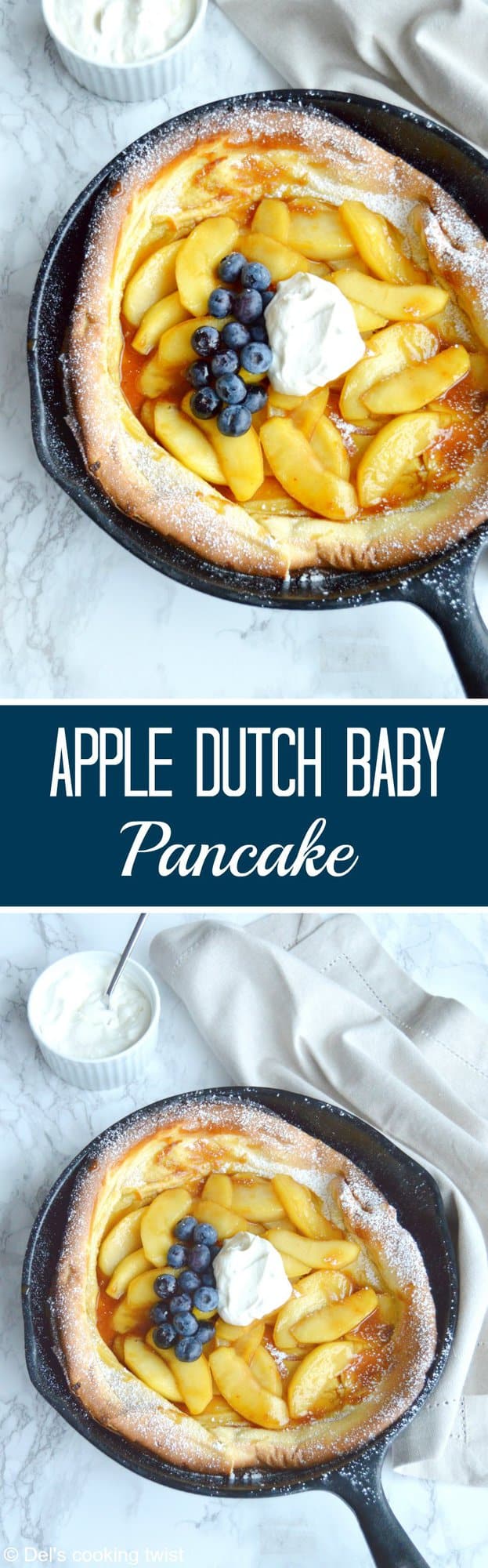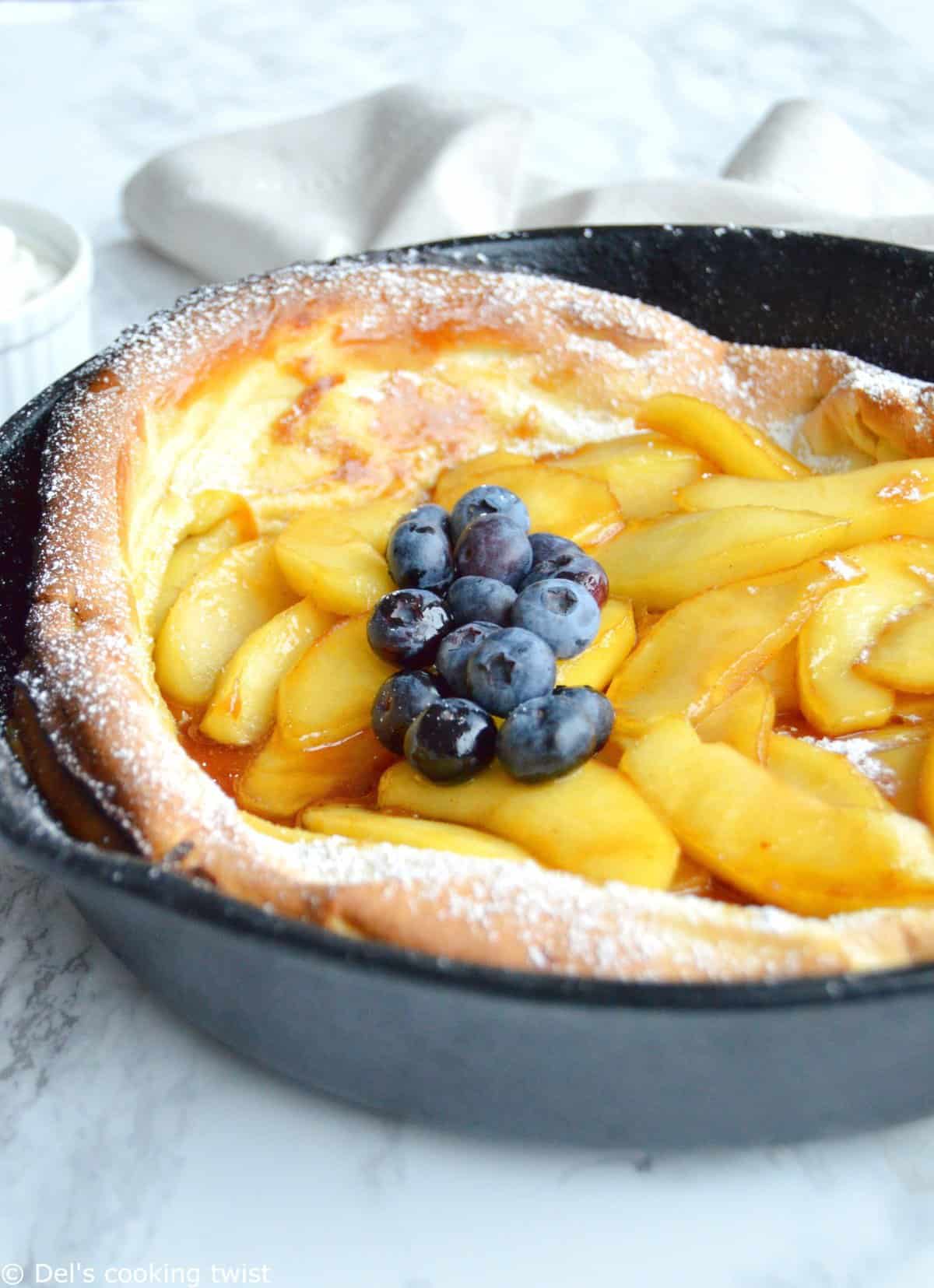Like for any pancake recipe, there are endless topping ideas when it comes to Dutch baby pancake. Here I opted for some apple wedges, deliciously melted in honey and butter. Add them warm on top of your Dutch baby, with some fresh blueberries for a pop of color, and a dollop of sour cream. Dust with confectioners’ sugar, and serve warm!