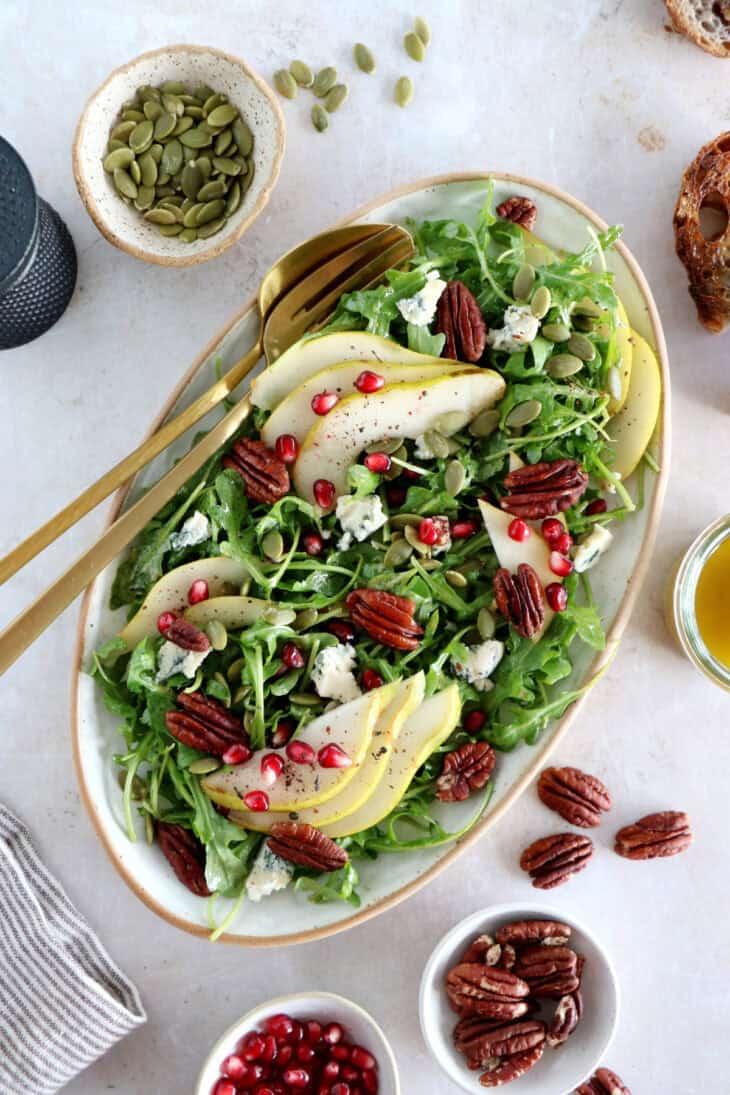 - Pour assembler la salade, placer la roquette dans un grand saladier avec les poires, les échalotes (si utilisation), les graines de grenade, les noix de pécan et les graines de courge. Verser la moitié de la vinaigrette et bien mélanger. Ajouter le bleu émietté ou coupé en dés et mélanger délicatement pour éviter d’écraser le fromage. Ajouter plus de vinaigrette au besoin, et servir aussitôt.