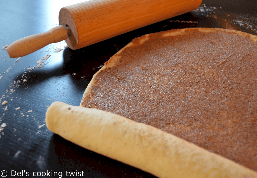 - Roll out the dough so it is about 3mm (1/8 in) thick and 30 cm (12-inch) wide. Spread the room temperature butter on top. Make a mixture of sugar and cinnamon and sprinkle it over the dough.