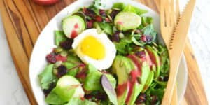 - Divide the salad into shallow plates, add the soft-boiled eggs on top, the avocado slices, and pour some raspberry vinaigrette over the salad before serving. Enjoy immediately. Bon appétit!