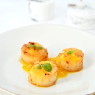 How to serve them? In my opinion, this pan-seared scallops with orange ginger sauce dish is perfect served on its own, as a starter to a 3-course meal. Place each scallop over a few splashes of crème fraîche, then lightly drizzle the orange ginger sauce over. For a lovely finish, I like to sprinkle a few microgreens over, but you can also go for mint leaves instead.