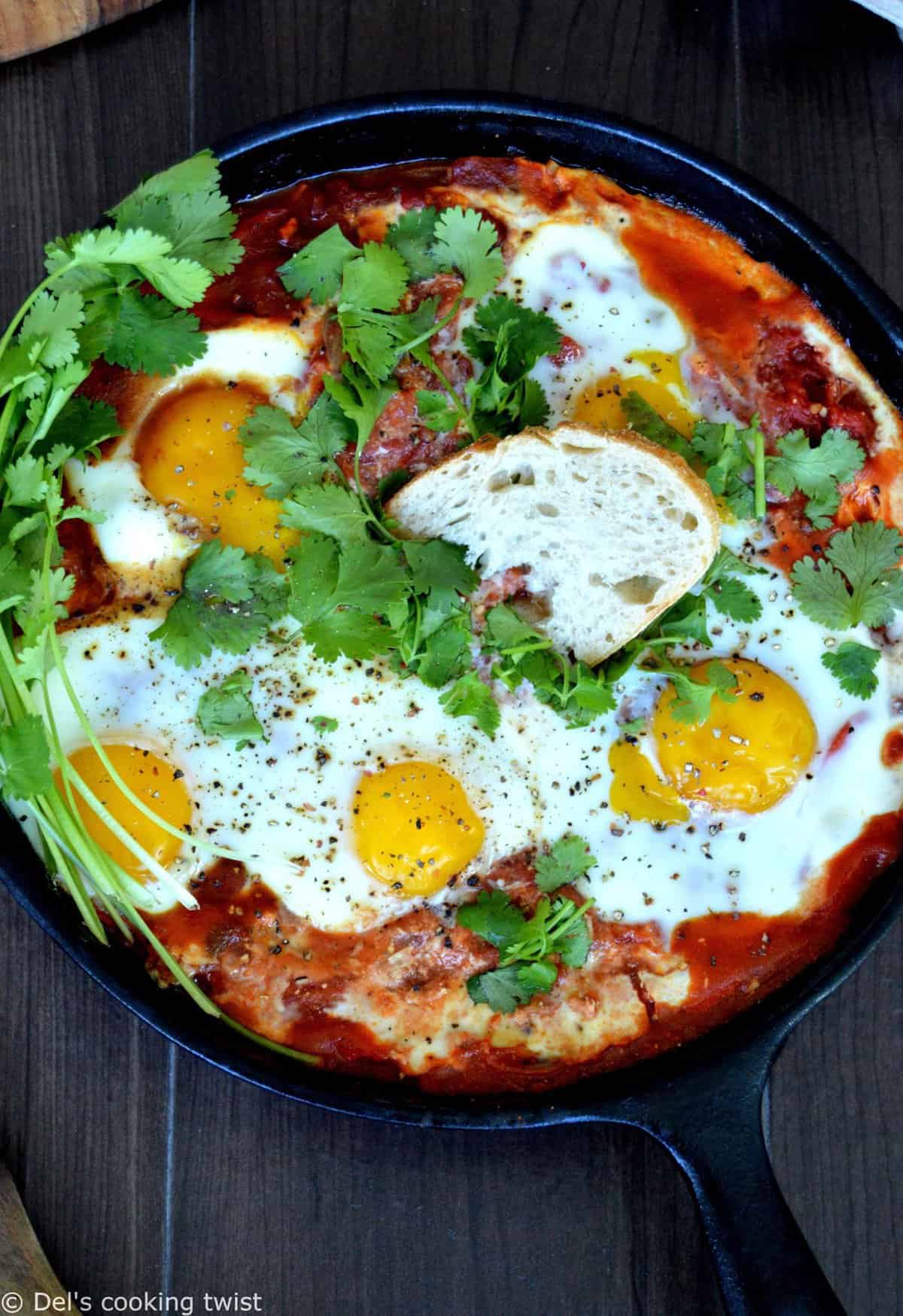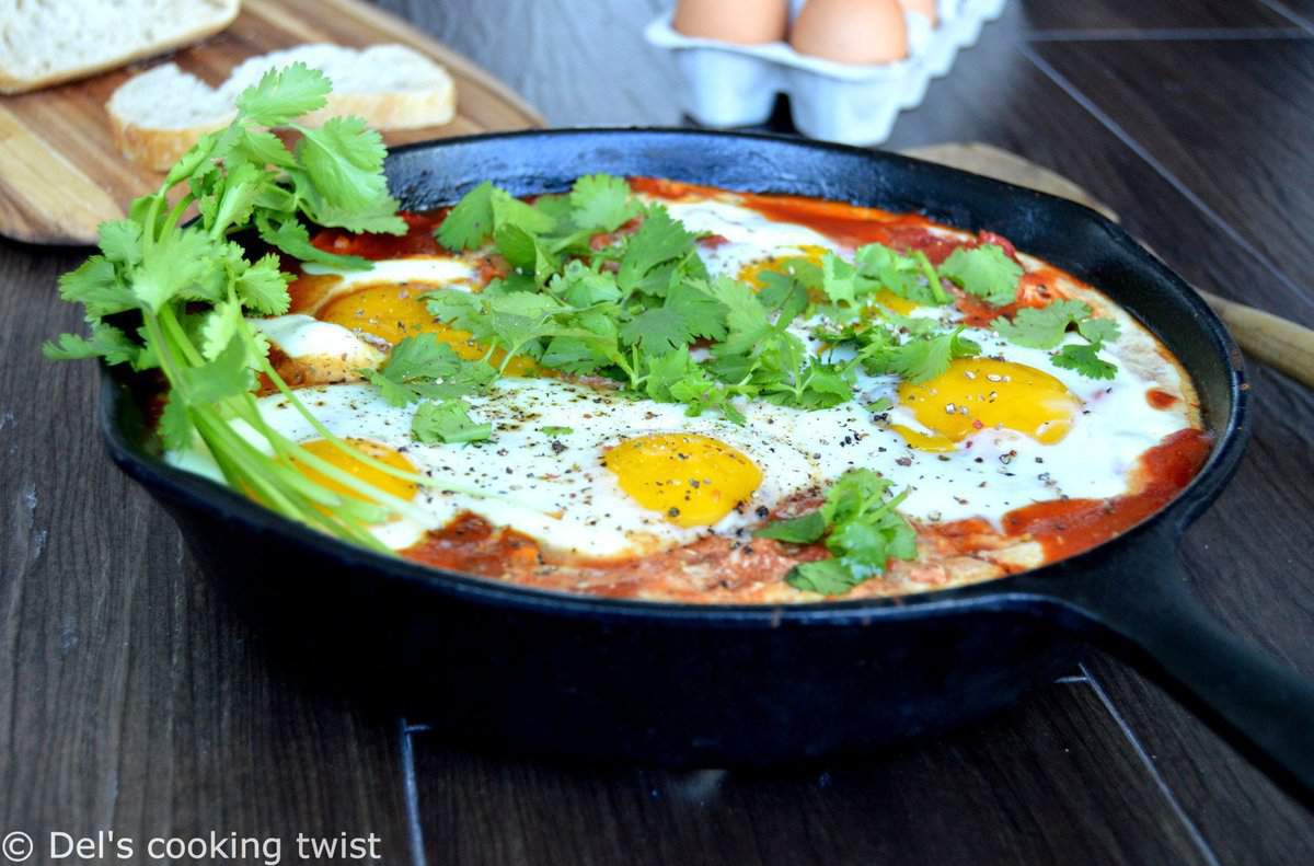A shaksuka is a simple dish prepared in a skillet and consisting of poached eggs served in a simmering tomato sauce with spices.