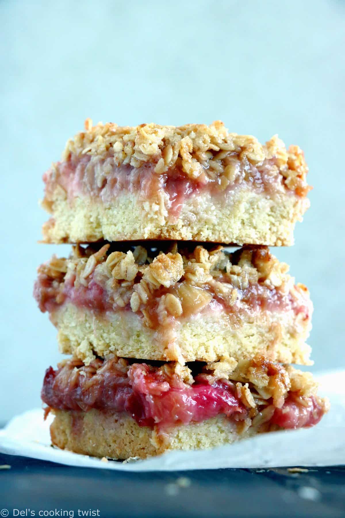 I created crumble bars. Berry crumb bars are very popular, and there are indeed countless of raspberry crumble bars recipes (the healthy ones that look almost too fragile, the ones made with the exact same crust for the top and bottom parts, and the other ones with an insane amount of sugar). Well today, I’m sharing rhubarb crumb bars instead, and I bet you will soon be obsessed with them!