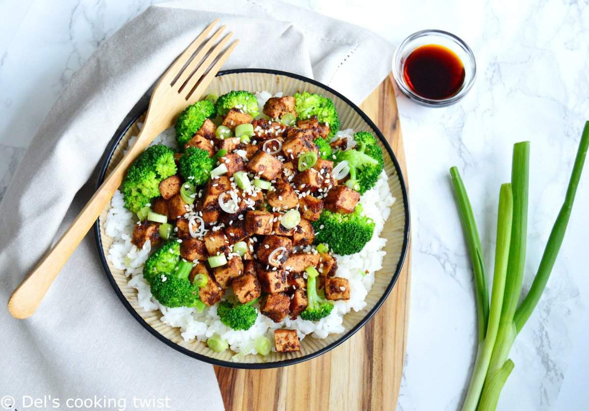 - Arrange the broccoli and tofu over the cooked rice, pour in the remaining sauce, and sprinkle with green onions and sesame. Enjoy!
