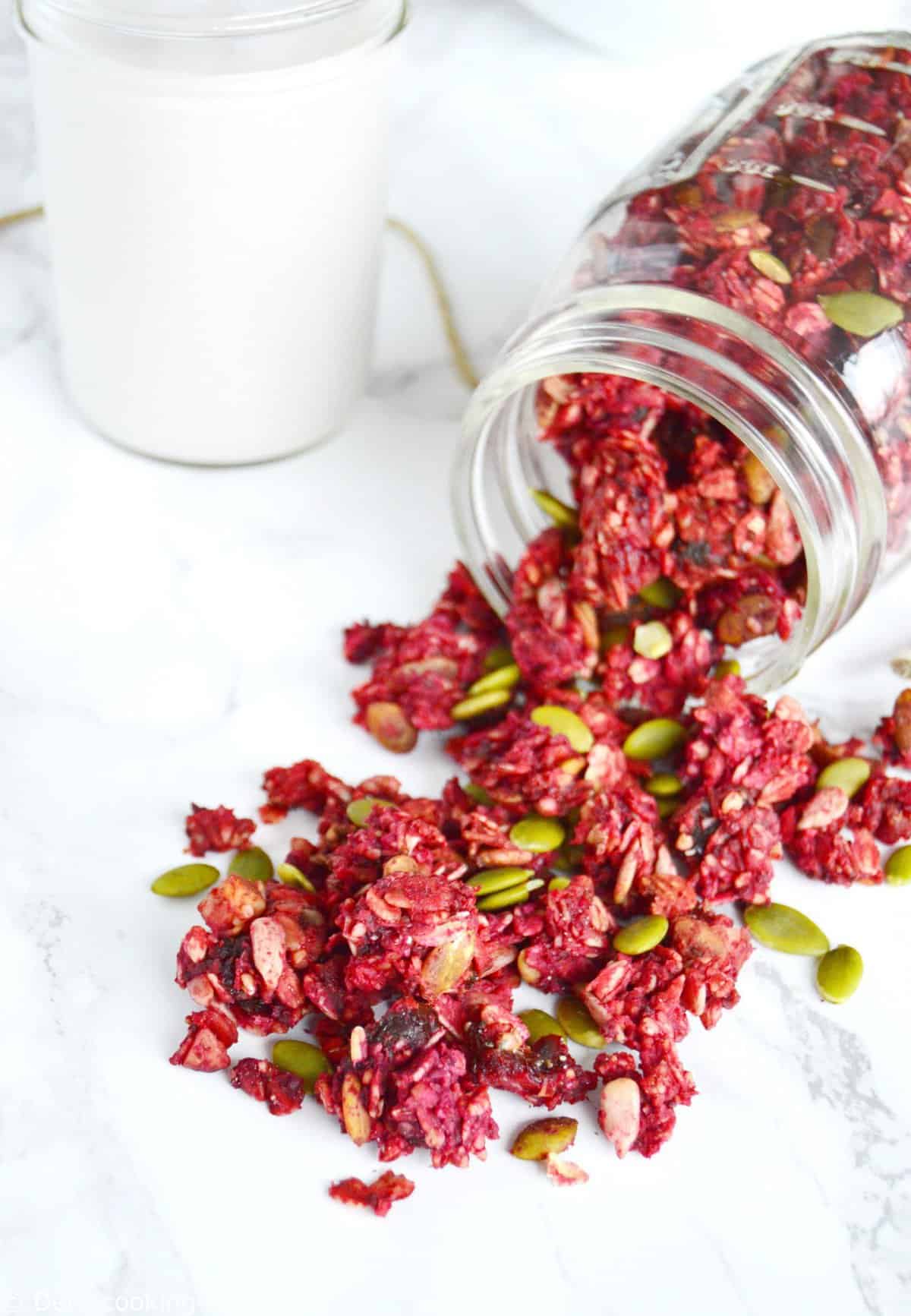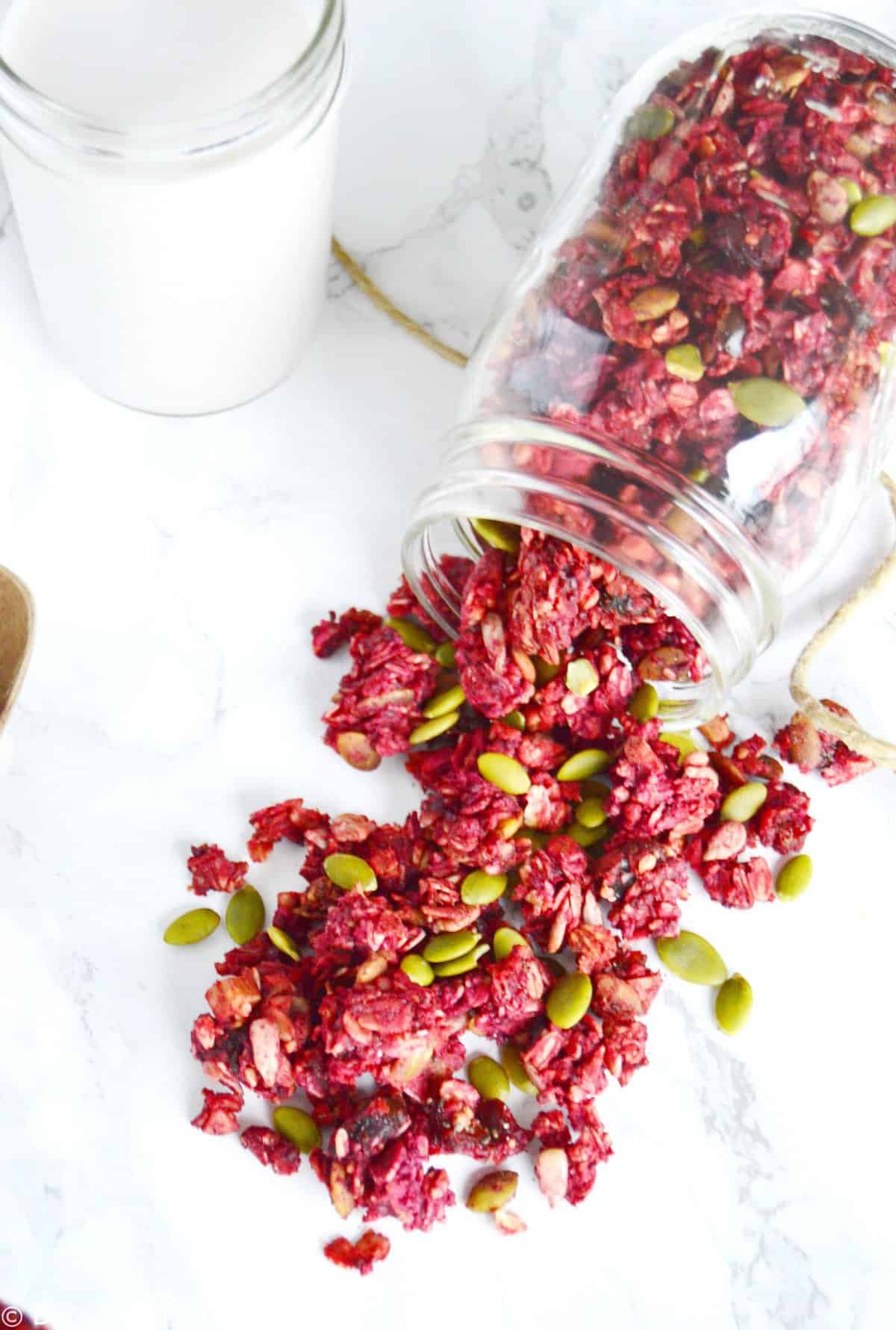 Full of health benefits, this vibrant pink-colored beet ginger granola loaded with superfoods will bring some fun to your morning routine!