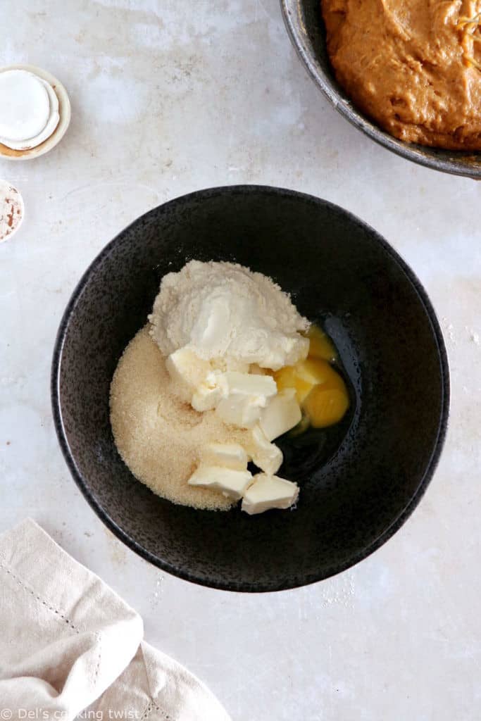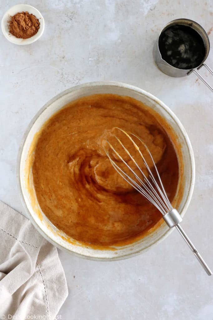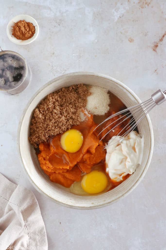 - In a separate bowl, whisk together pumpkin, sour cream, eggs, vanilla and both sugars until no lump remains. Gradually pour in the slightly cooled brown butter, whisking as you go.