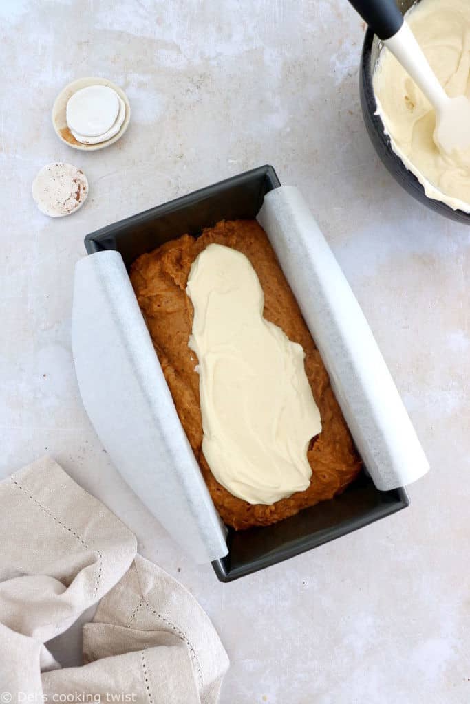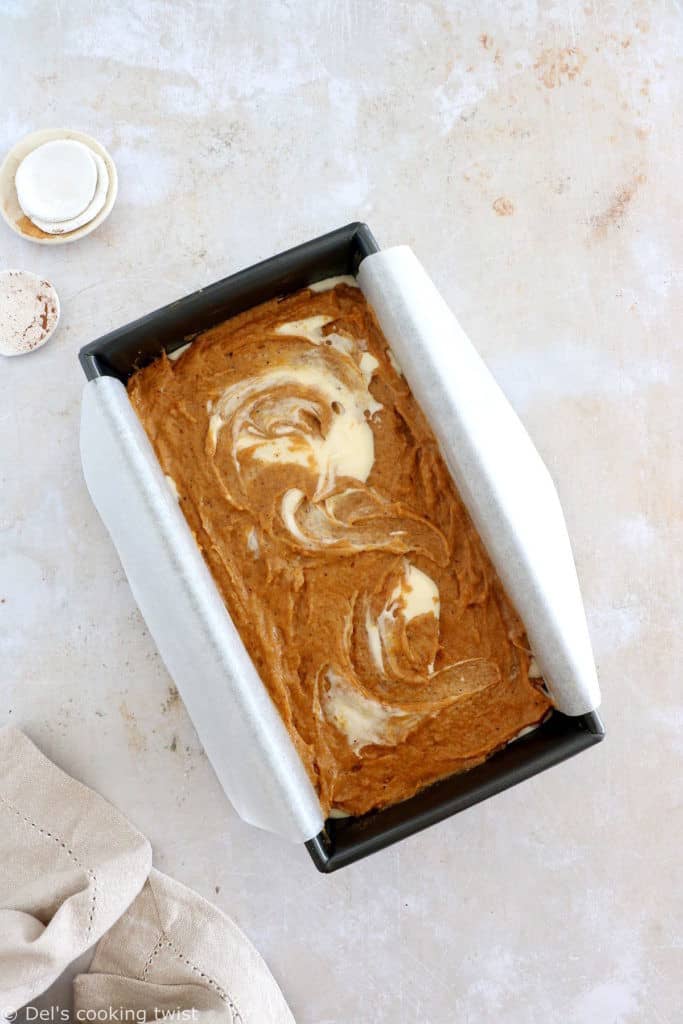 4. Assemble the pumpkin bread, layering the cake batter and cream cheese in between, and making a few swirls in the batter as you go. And voilà, it’s ready to bake!