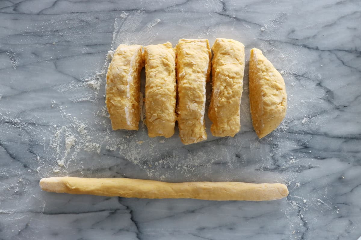 - Cut each rope into small pieces, forming the gnocchi.