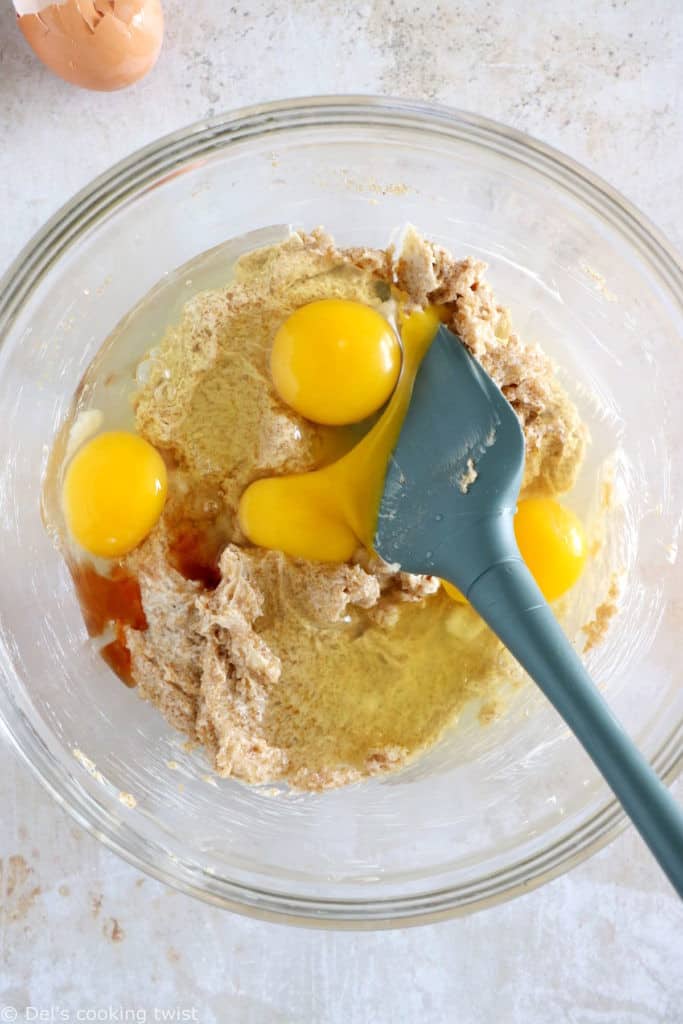 - In a separate bowl, whisk turbinado sugar with softened butter for about 1 minute, until light and fluffy. Add the eggs, one at a time, whisking after each addition, then add the vanilla extract and stir until combined.