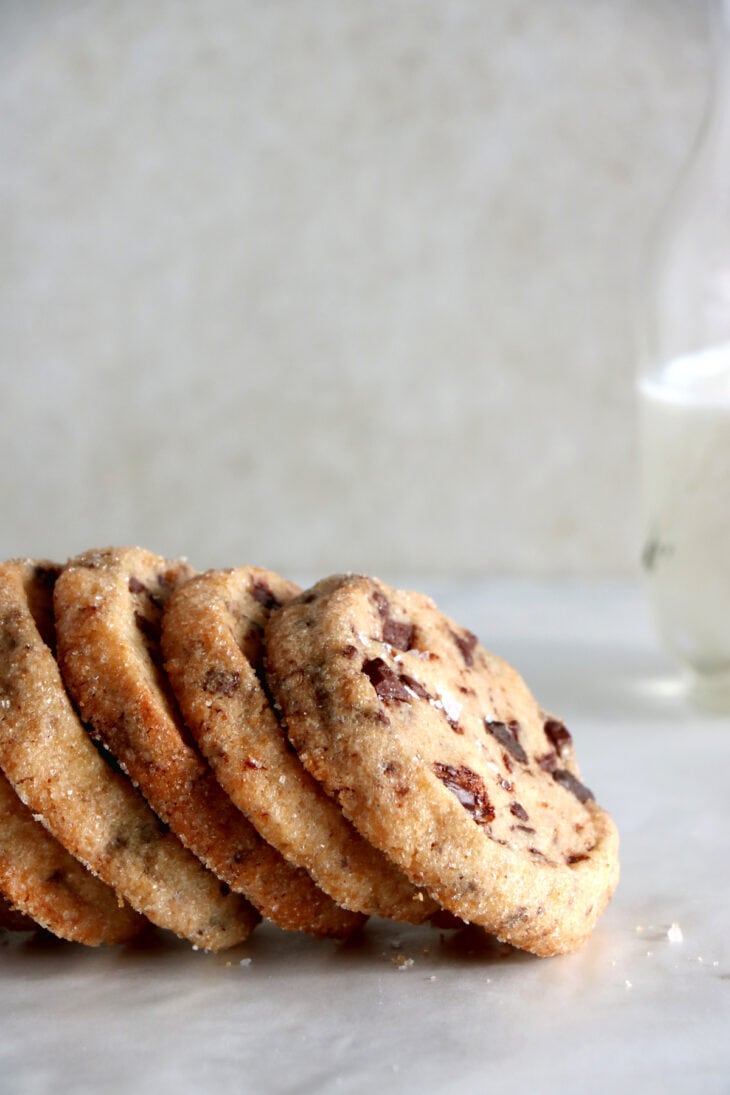 I discovered this very shortbread cookie recipe when using leftover cookie dough from my Milk and Cookie Cups recipe. Halfway between a shortbread and a chocolate chip cookie, the dough has a unique texture that creates the perfect shape for the cookie cups. I’ve become completely obsessed with the recipe, and soon, I would use the entire dough to create a whole batch of regular-shaped cookies.