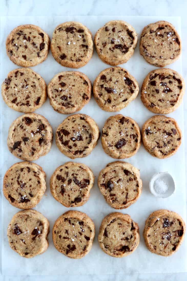 - Remove the plastic wrap from the dough. Roll the outside of the logs in granulated sugar, then using a serrated knife, carefully slice each log into ½-inch-thick rounds (1,5 cm), and place them on the prepared baking sheets about 1 inch (2,5 cm) apart, as they won’t spread much. Sprinkle with flaky salt.