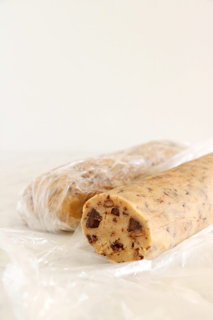 - Divide the dough in half, placing each half on a large piece of plastic wrap. Fold the plastic over so that it covers the dough to protect your hands from getting all sticky. Using your hands, form the dough into a log shape, and repeat with the other half of dough. Chill in the refrigerator until totally firm, about 2 hours.