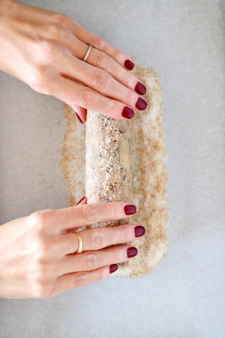 - Roll the logs in granulated sugar. Remove the plastic wrap and roll each log in sugar, pressing gently with your hands to ensure sugar sticks to the log.