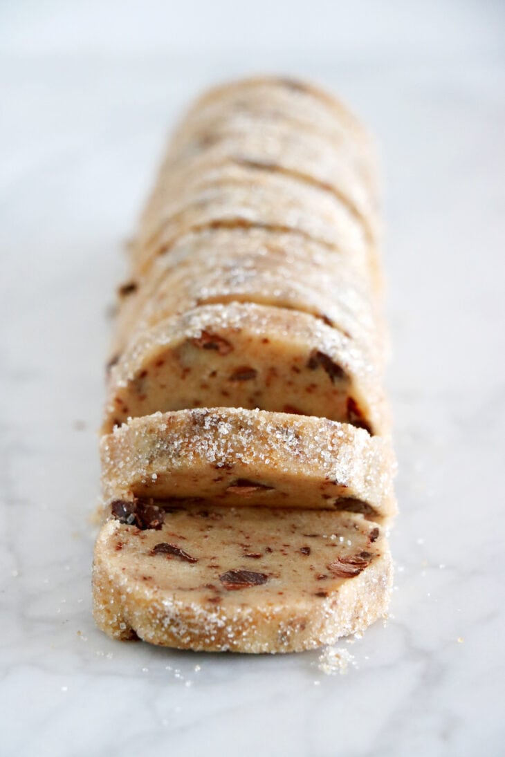 - Coat in sugar. While not strictly necessary, coating the logs of cookie dough in sugar before slicing ensures crispy edges when baking.