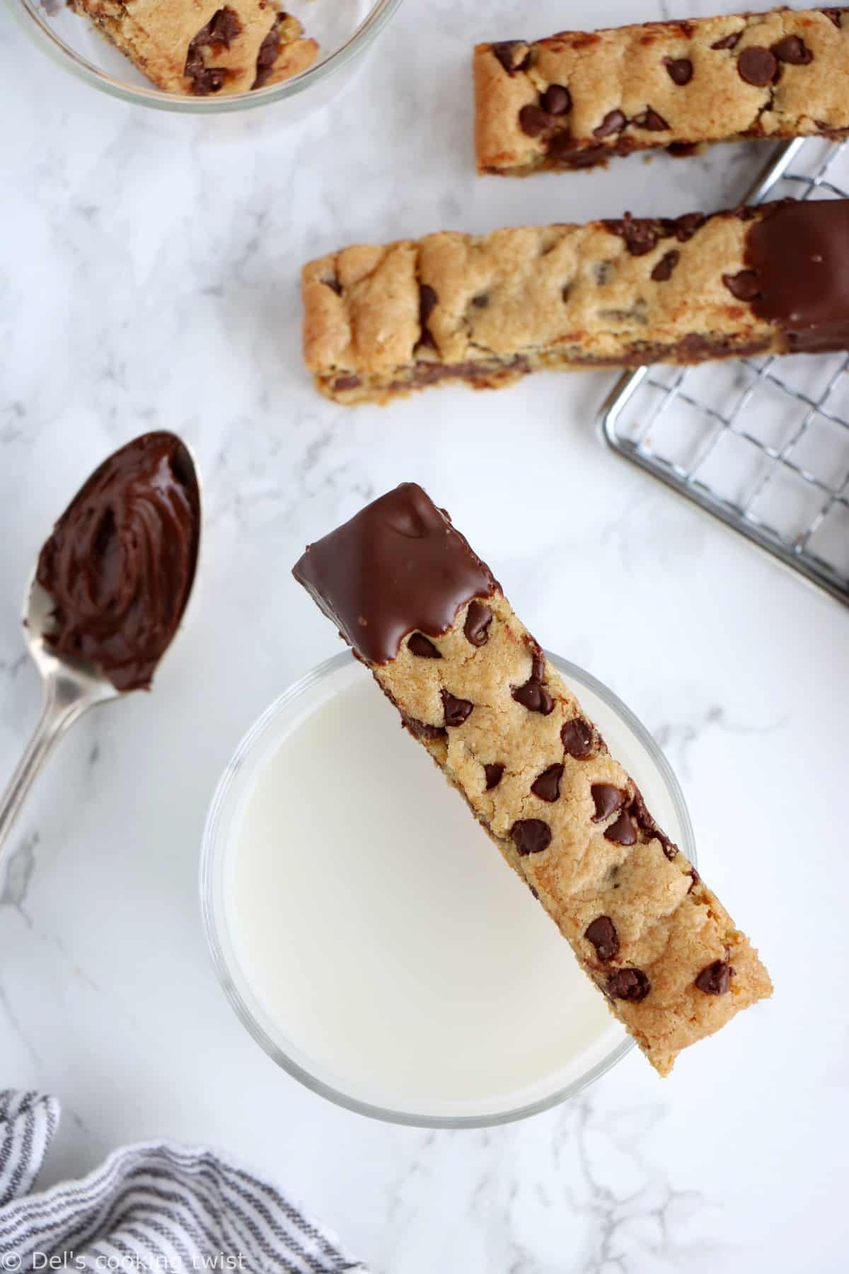 - Melt the chocolate in a medium bowl in the microwave in 30 second increments, stirring vigorously with a spoon after each increment, until completely melted and smooth. Dip the chocolate chip cookie sticks in the melted chocolate until 1/4 to 1/3 of the stick, and place onto a baking sheet. Allow chocolate to set in the refrigerator for about 20-30 minutes before serving. Dip into a cold glass of milk and enjoy!