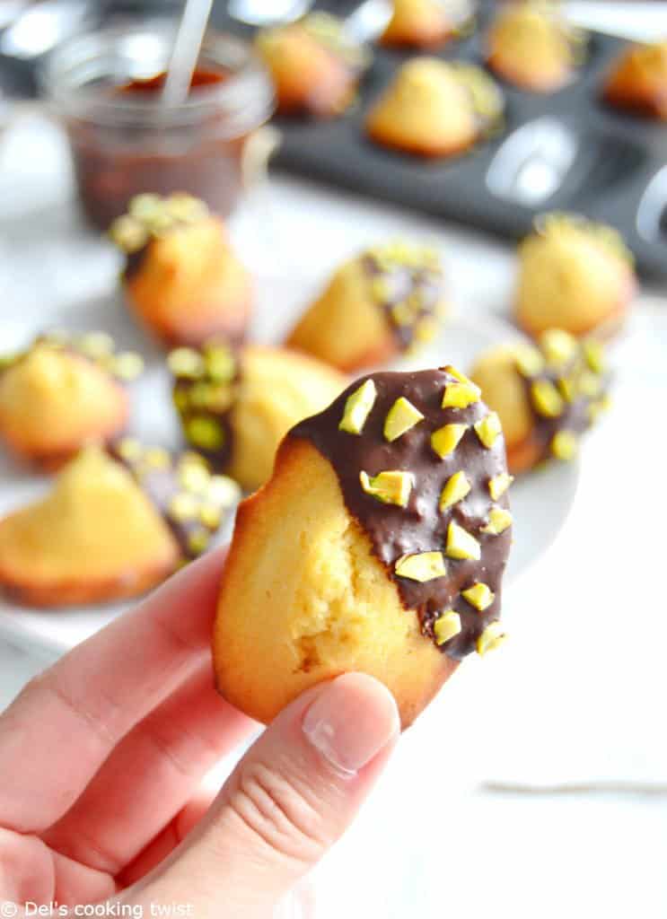 I offered these chocolate dipped madeleines sprinkled with pistachios for Thanksgiving and everyone was amazed by their lovely, elegant look and their delicate taste, which couldn’t make me happier. I will for sure make them again for the holidays, and I hope you will too!
