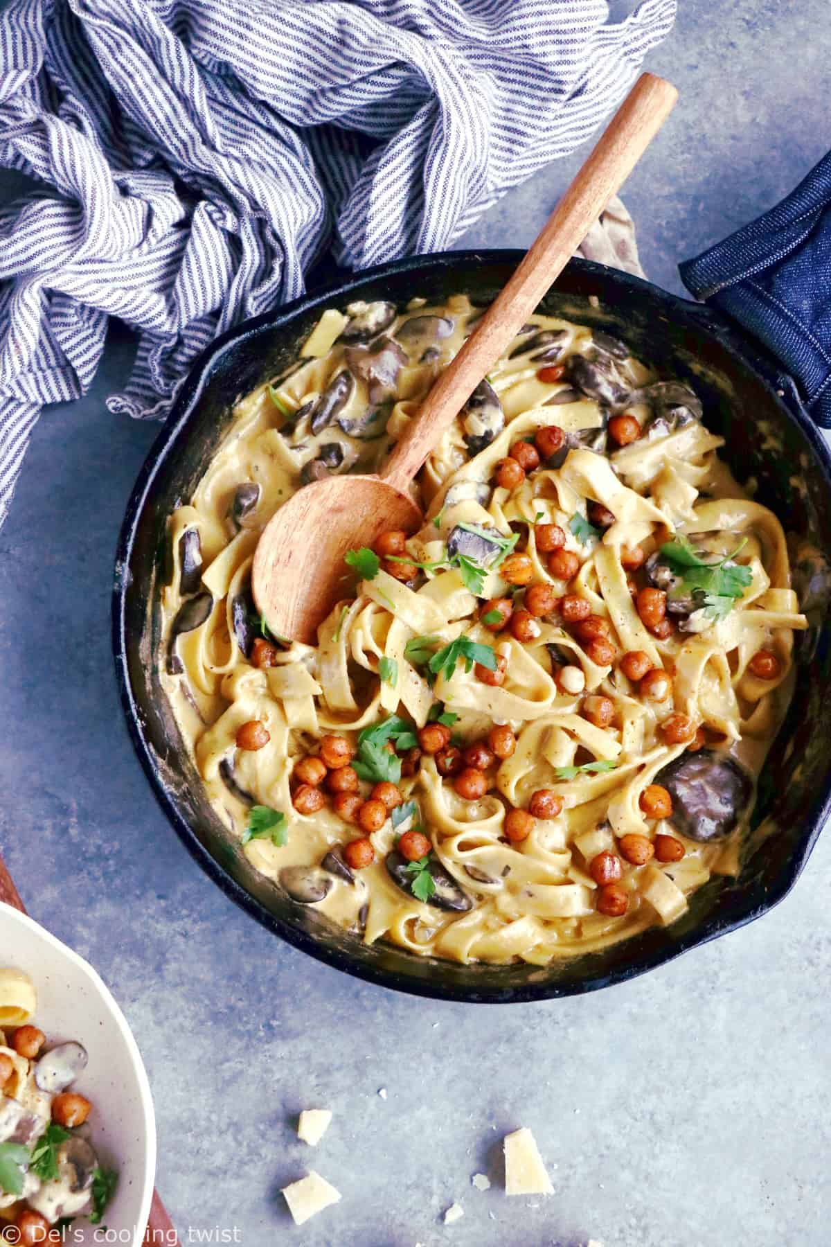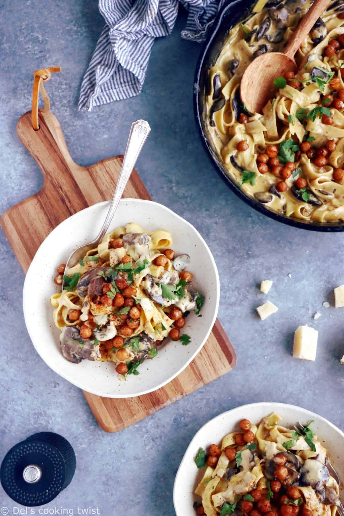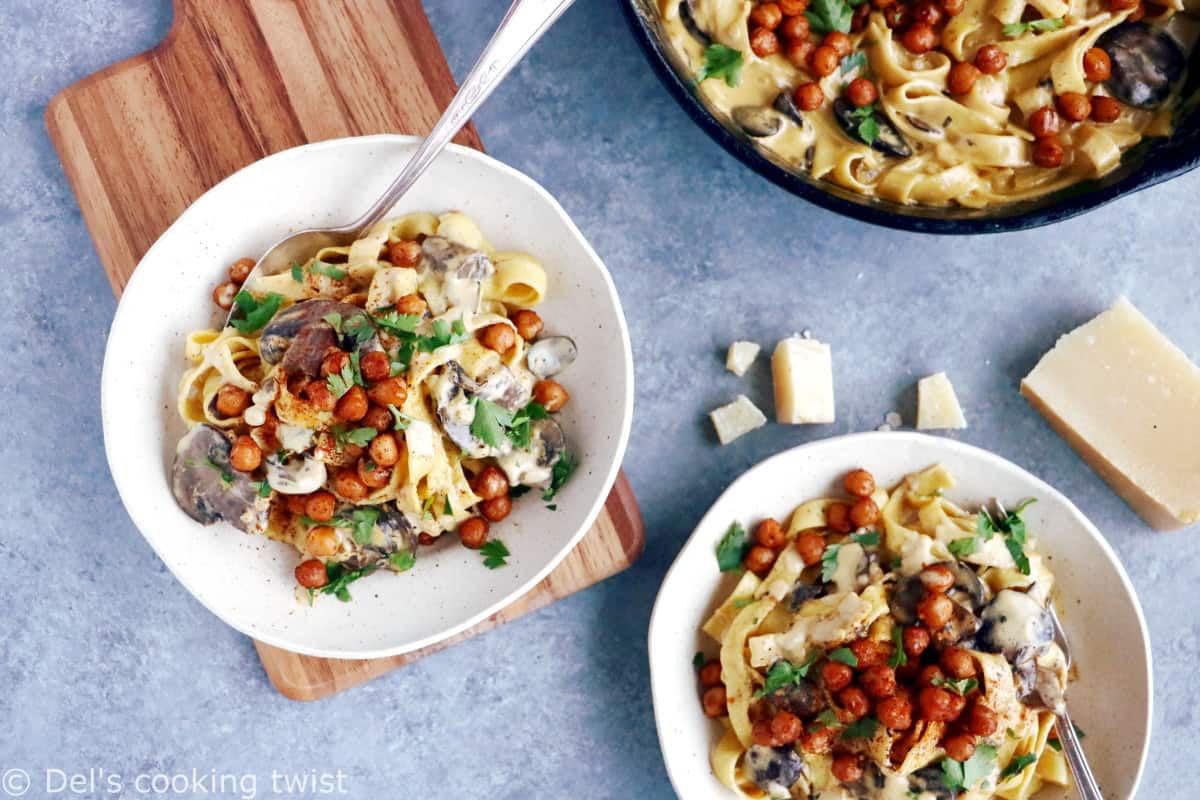 The pasta recipe I suggest today comes with a classic creamy mushroom sauce with white wine, topped with crispy spiced chickpeas. It’s packed with comforting flavors, is very nourishing, and slightly addictive too!