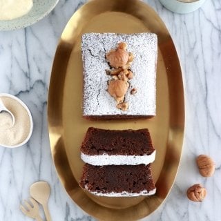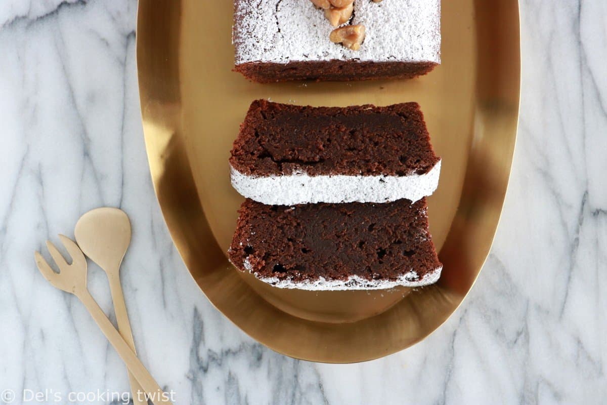 I baked the chestnut chocolate fondant in a classic loaf pan here and I really enjoy the rich, dense and decadent fondant texture in the center. You could also bake it in a small bundt cake pan or in a classic square baking pan or a 9-inch (23 cm) springform. Keep in mind that the baking time might change a little bit and I would advise to keep the same baking time if using a bundt cake pan but reduce the baking time to 30-35 minutes max if using a springform as the cake. To make sure your chocolate chestnut cake is done, insert a toothpick inside. If it’s still creamy, you need to bake a little longer.