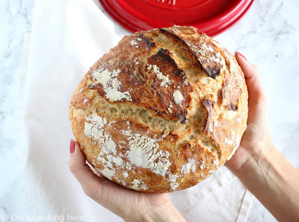 To make the magic happen and get the perfect crispy texture, you need a heavy covered pot (cast iron, enamel or ceramic such as a Dutch oven). And if you don’t have one yet, I highly recommend you invest in one as it will last a lifetime and you will end up using it a lot – not to mention that it will spare you some money on the long run as you will not need to purchase expensive bread at the bakery. Seriously, this is probably the best cookware I invested in so far. I personally use a 4 qt round Dutch oven and find the size just perfect, but you could use a 6 qt and even a 8 qt, round or oval.