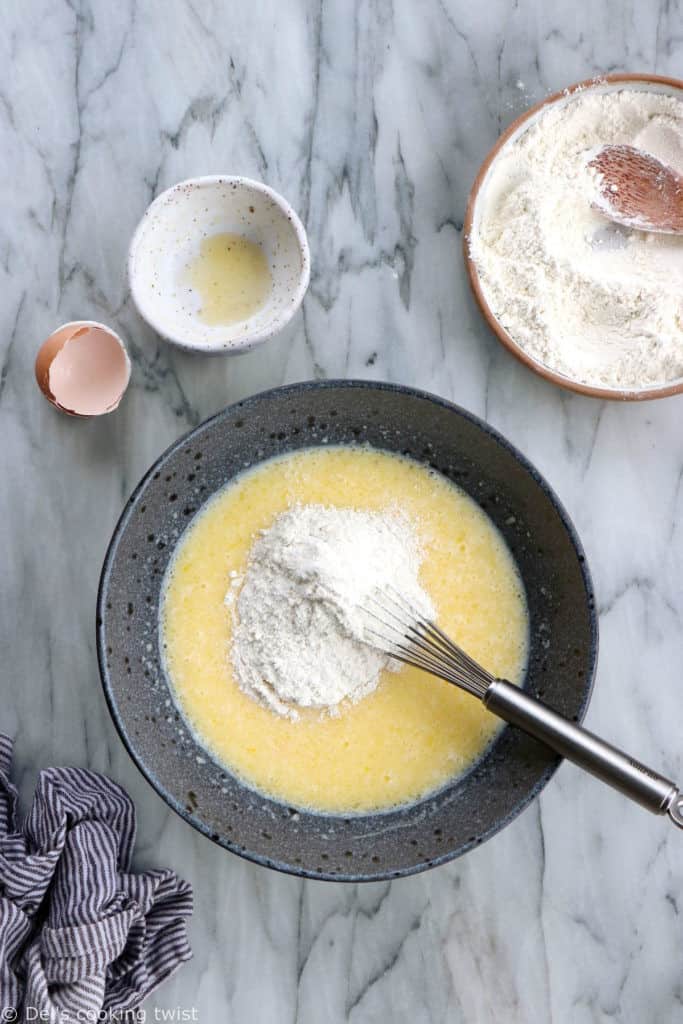 - In a small bowl, whisk together flour, sugar, baking powder, and salt. Set aside.