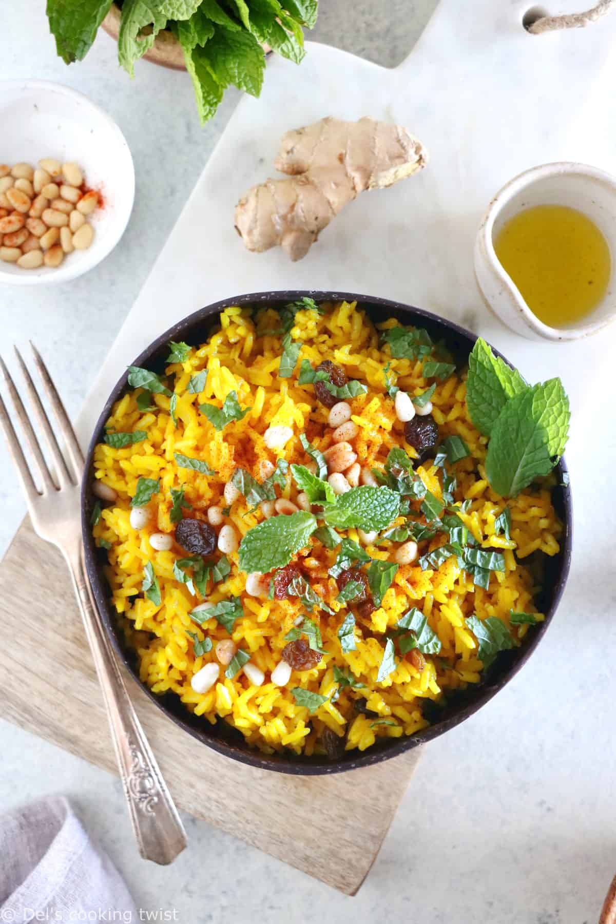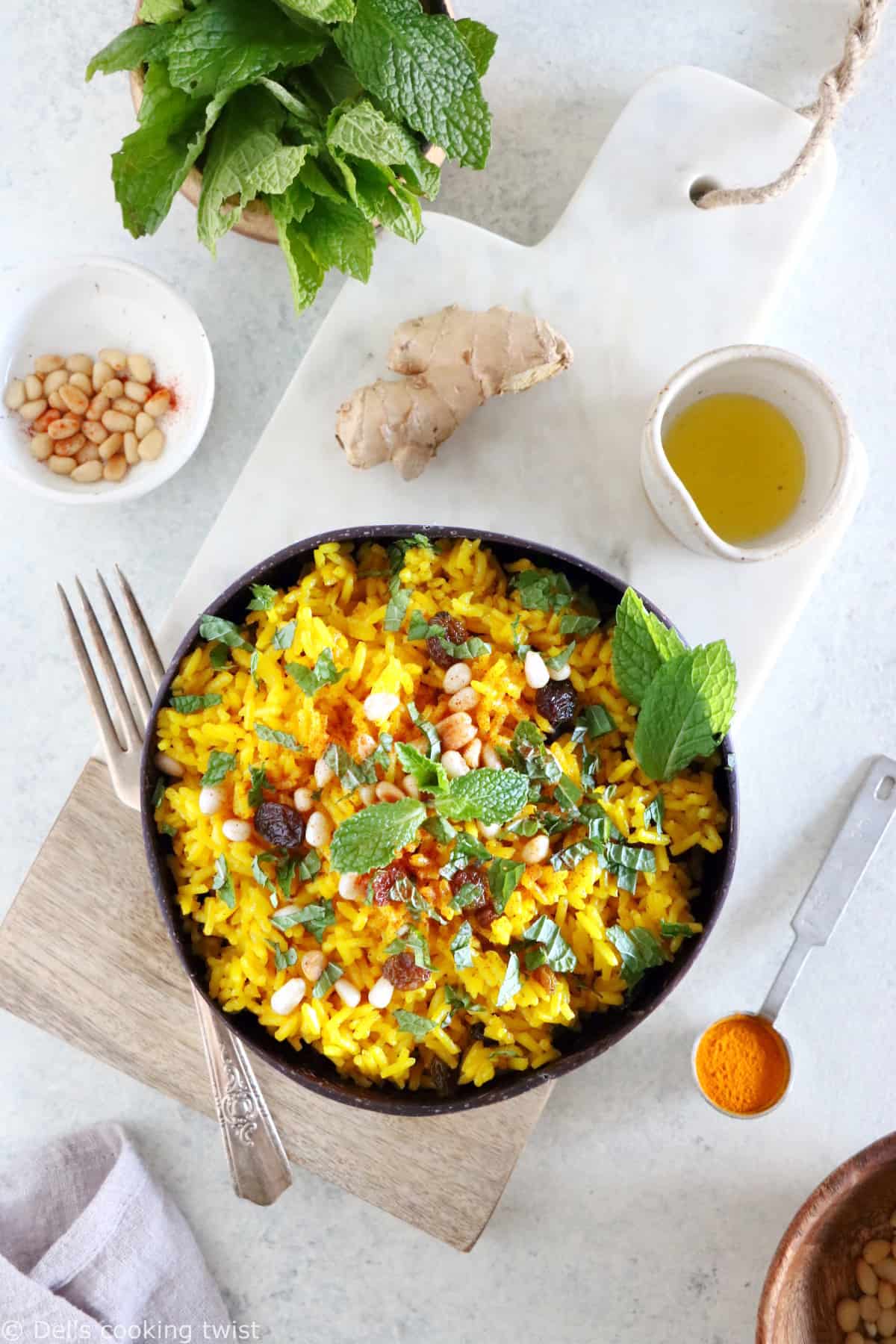 I added my little twist here and there, making my very own version with raisins and fresh mint leaves. The result is surprisingly delicious. Served as a side, it adds some vibrance and bold yet gentle flavors to a dish. Turmeric rice can also be served alongside vegetarian dishes or be used as a base to grain bowl and salad recipes. Let’s make it together!