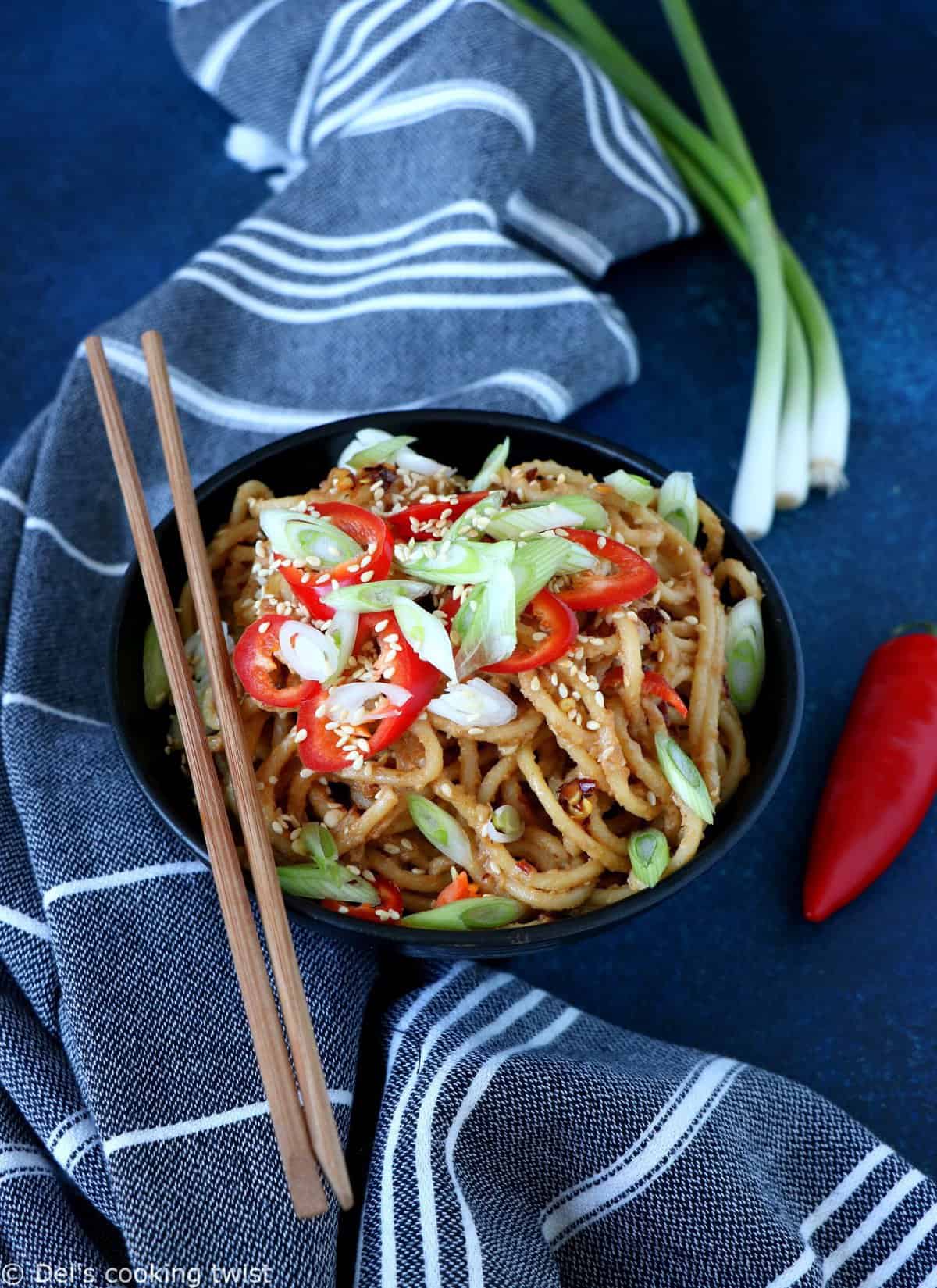 - Drain the noodles and toss immediately through the peanut butter sauce. Add the chili, spring onions and sesame seeds and toss again. Serve and enjoy!