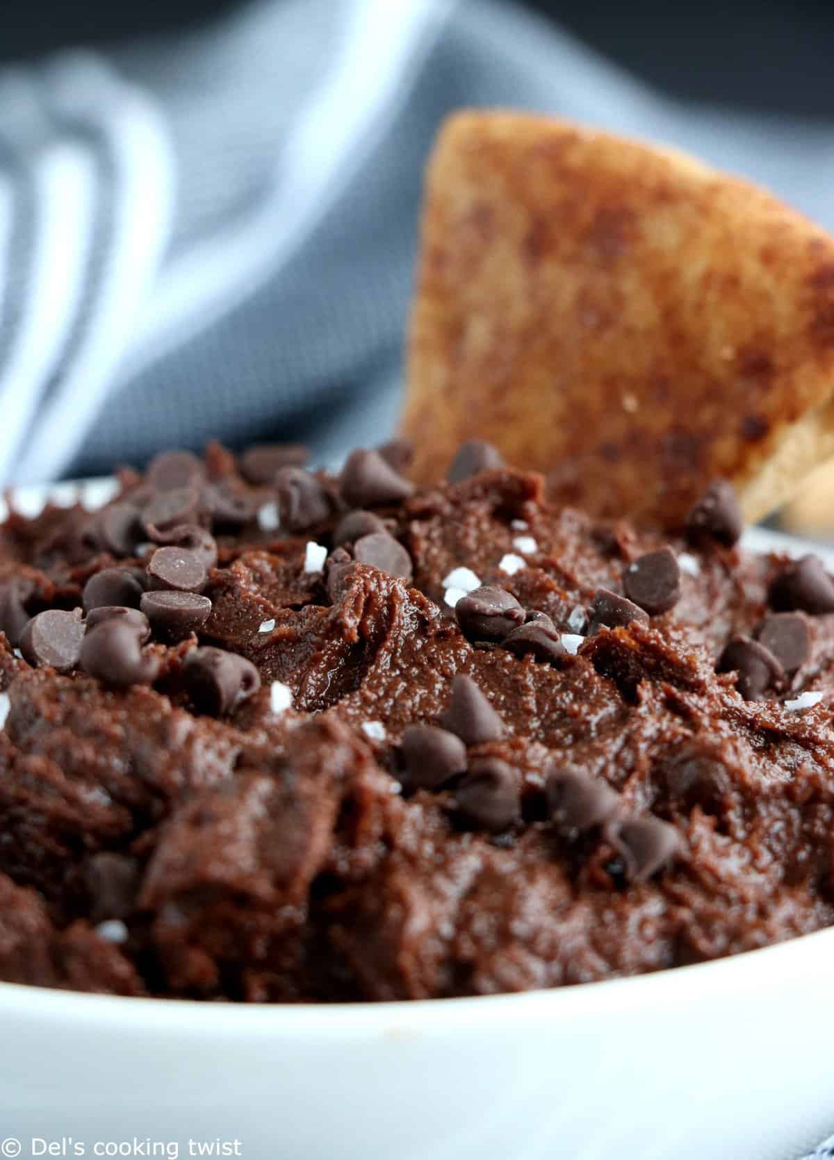 So no chocolate hummus for you on the blog as I would never share a recipe I do not like personally. Instead, let’s go for a rather unhealthy one (it’s Halloween after all, so it’s allowed): a chocolate brownie batter! Remember when you lick the spoon when baking a brownie? Well, that’s pretty much the same thing here… hmmm! The difference is that I didn’t use any eggs here, to make it easier to digest (raw eggs are usually not recommended, although nothing bad ever happened to me when licking a cake batter bowl a little bit more than I should). I also cut the amount of flour you usually have in a brownie recipe to make it softer in texture. This way you can dip some delicious cinnamon pita chips…