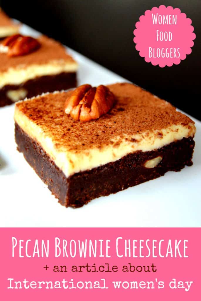 Étape huit (oui, le huitième point est mon dernier car nous sommes le 8 mars, Journée Internationale de la femme), eh bien… tout le monde meurt de faim maintenant, non ? Alors c’est l’heure de savourer la bonne recette de Brownie cheesecake aux noix de pécans que je vous ai préparé. Bon appétit !