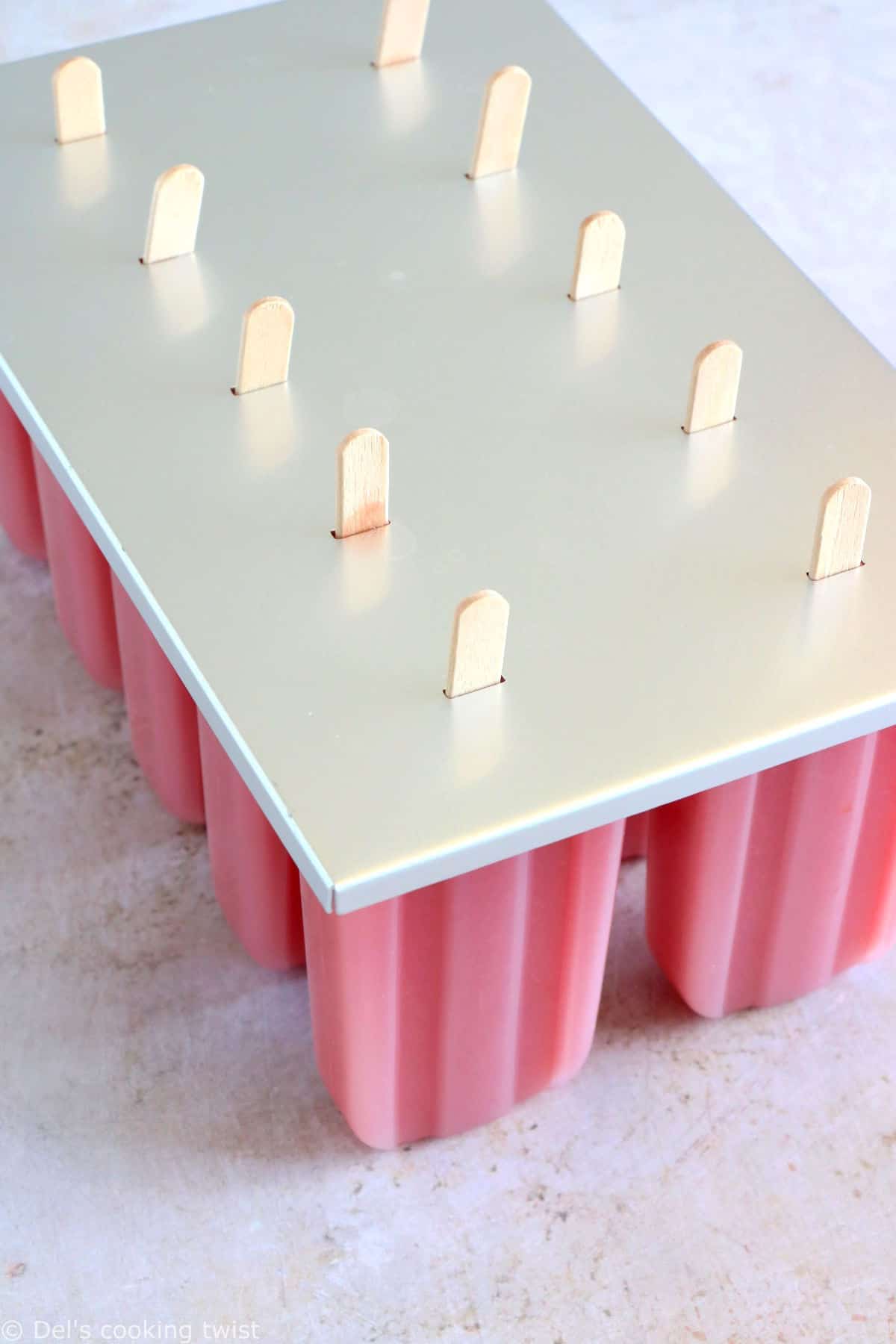 Pour démouler les popsicles, il suffit de passer les moules sous l’eau tiède pendant 5-15 secondes (parfois plus) en les disposant de côé. Ensuite, tirez délicatement sur le petit bâtonnet et les glaces devraient se démouler facilement.