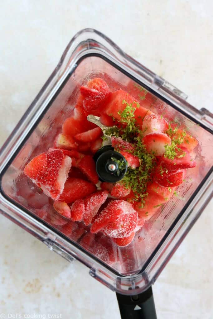- Placer la pastèque et les fraises dans un blender. Ajouter le zeste et le jus de citron vert, le miel (ou le sirop d’agave), et mixer jusqu’à l’obtention d’une texure homogène.
