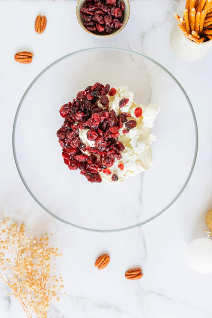 - Commencez par battre le fromage frais et le chèvre avec les cranberries au batteur électrique, et assaisonnez de sel et de poivre.