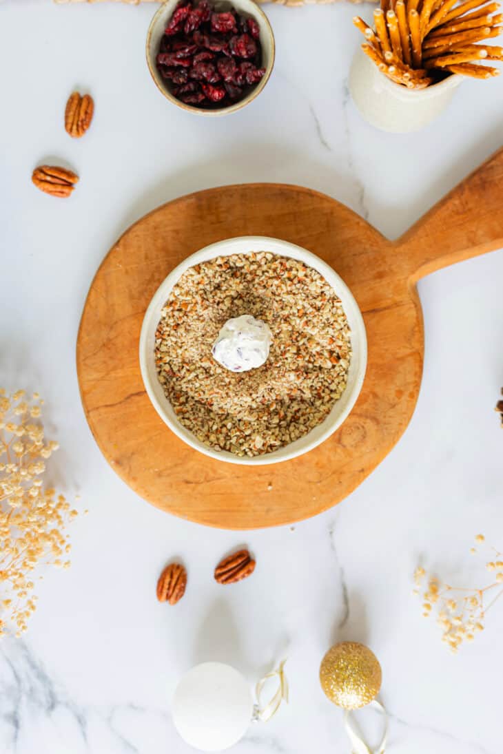 - Recouvrez les boules de fromage de noix de pécan concassées et ajoutez un stick de bretzel au centre pour que vos invités puissent les attraper facilement. C’est prêt !