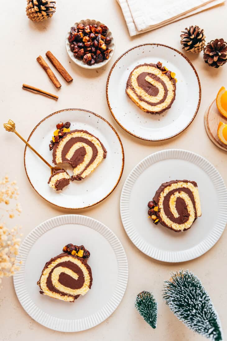 Retrouvez ici une version de la bûche roulée dans toute sa simplicité. On y retrouve un biscuit roulé léger, moelleux et subtilement parfumé à l’orange, garni d’une onctueuse ganache au chocolat. Pour parfaire le tout, on ajoute des fruits secs caramélisés qui apportent une petite touche croustillante à l’ensemble. Chaque bouchée est irrésistible de gourmandise. Servez avec un mousseux pour une expérience encore plus festive !