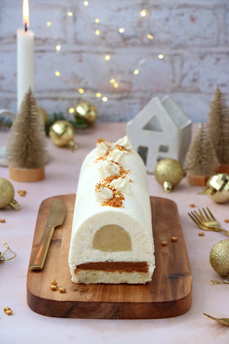 - Démouler la bûche sur un plat de service puis laisser décongeler au réfrigérateur 4 à 6 heures avant de servir. Décorer avec des biscuits Spéculoos mixés.