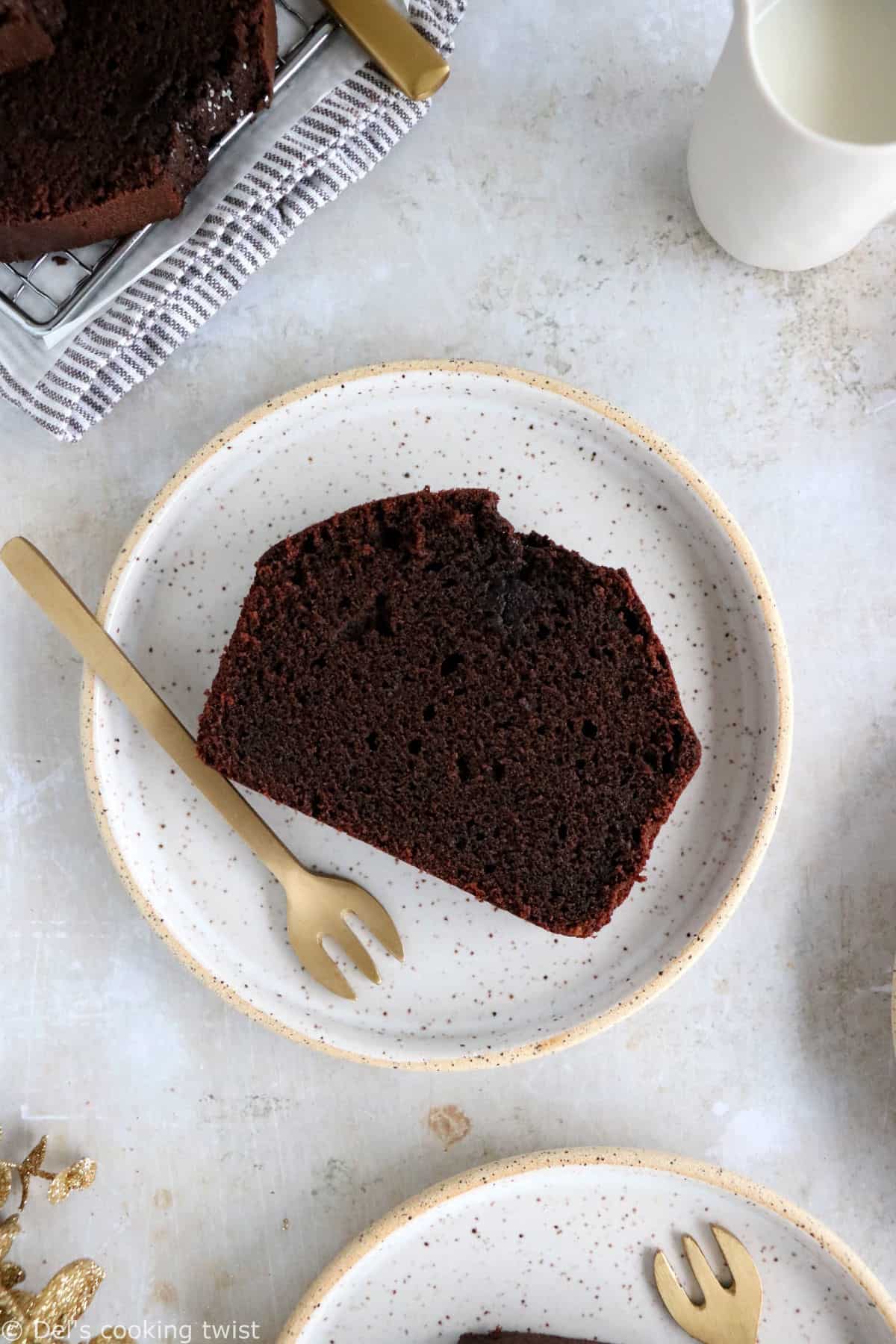 Croyez-le ou non, mais je trouve que ce cake au chocolat est encore meilleur le jour suivant. Je recommande dans un premier temps de le laisser refroidir complètement à température ambiante, puis de l’envelopper de film alimentaire. Laissez-le ainsi reposer sur le comptoir de la cuisine idéalement toute une nuit afin de lui donner son côté bien moelleux. Vous pouvez ainsi le conserver jusqu’à 3 jours, après quoi le cake risque de s’assécher un peu. Évitez par ailleurs de le conserver au réfrigérateur.