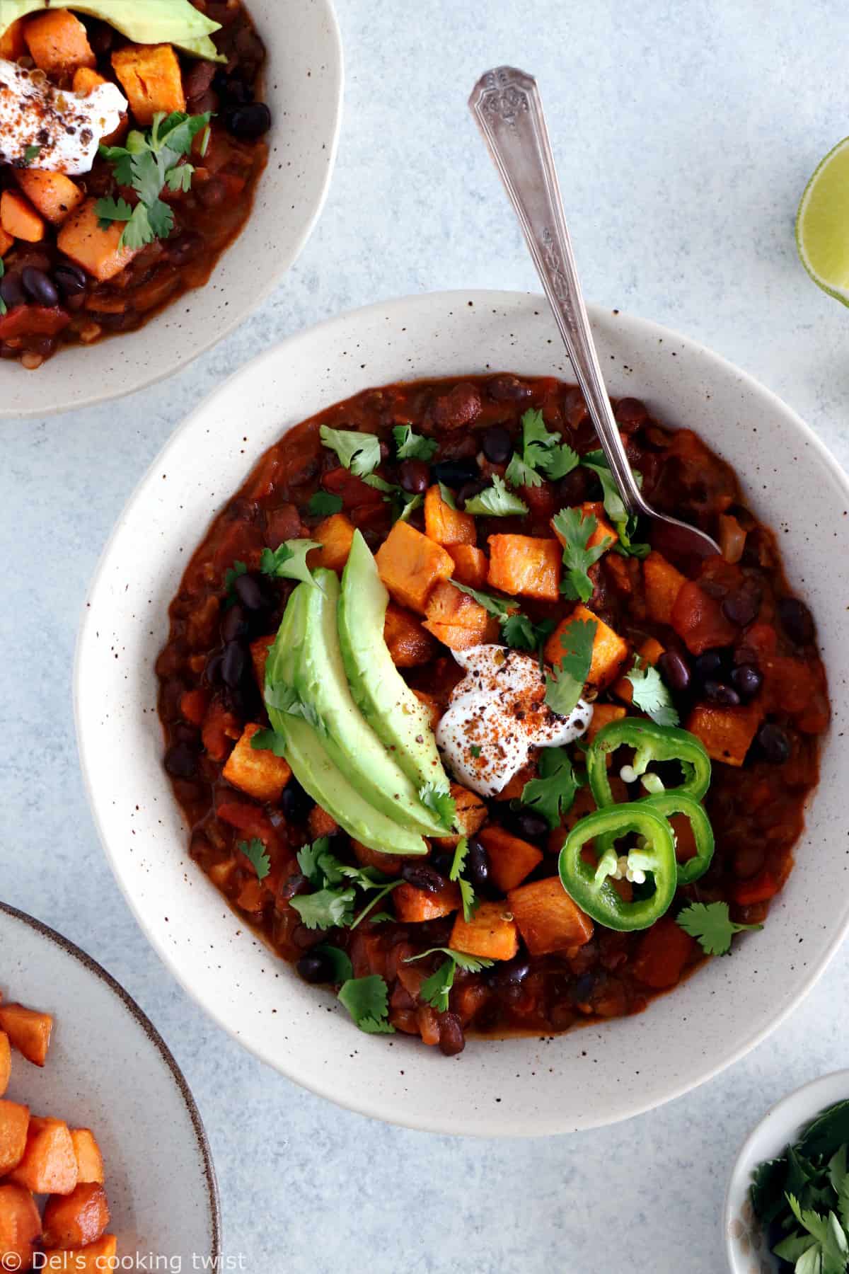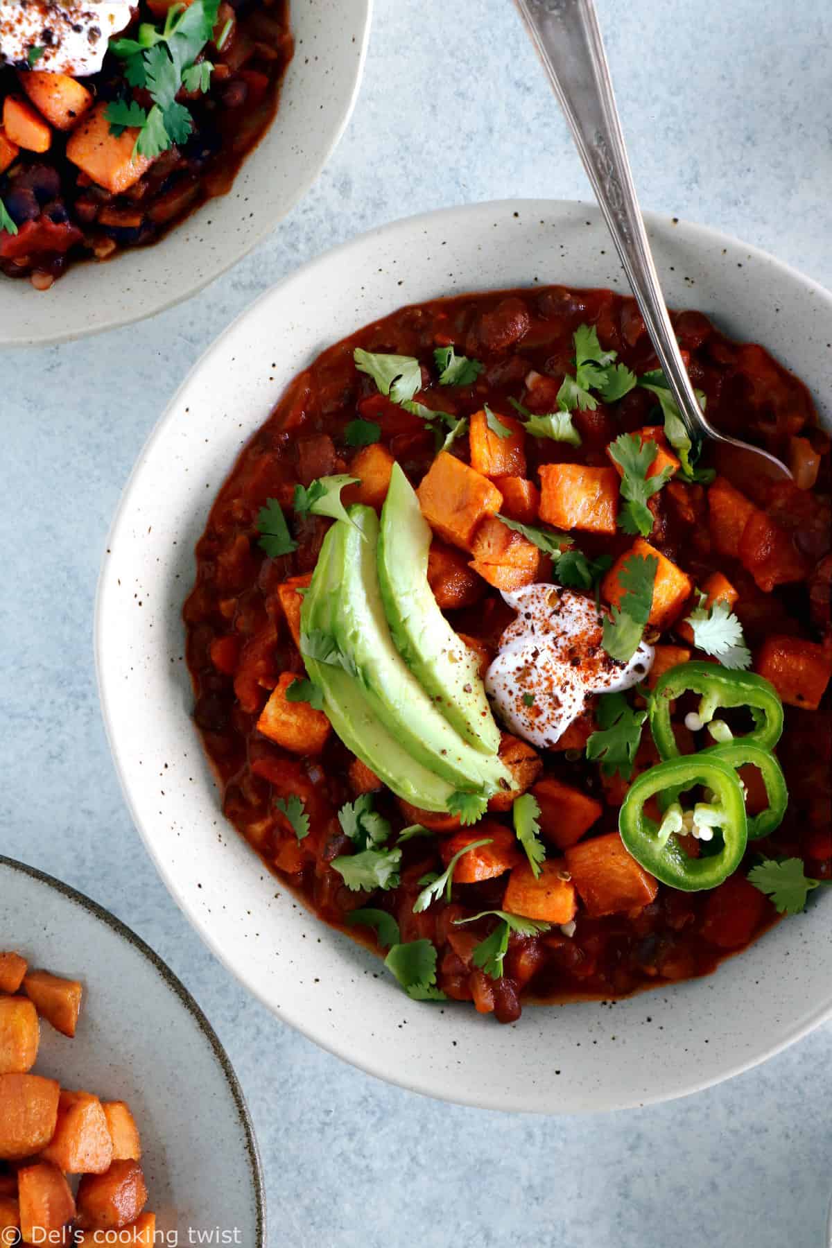 - Un plat vegan complet et nourrissant – Je vous promets que la viande ne vous manquera pas dans ce chili. La combinaison entre les patates douces, les haricots noirs et les autres légumes et épices en font un plat parfaitement nourrissant, que j’accompagne généralement de riz.