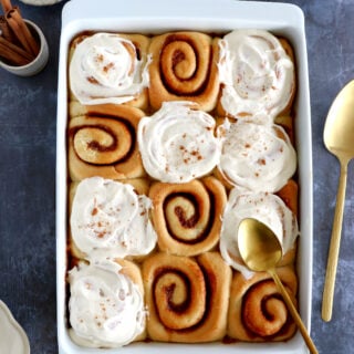 Vous pouvez également congeler les cinnamon rolls (sans le glaçage) une fois cuits et refroidis pendant 2-3 mois. Laissez-les décongeler toute une nuit à température ambiante et placez-les au four 15 minutes environ avant de servir. Ce n’est toutefois pas ma méthode préférée et je préfère pour ma part préparer la recette en partie à l’avance et la cuire au dernier moment (cf. instructions détaillées ci-dessous).