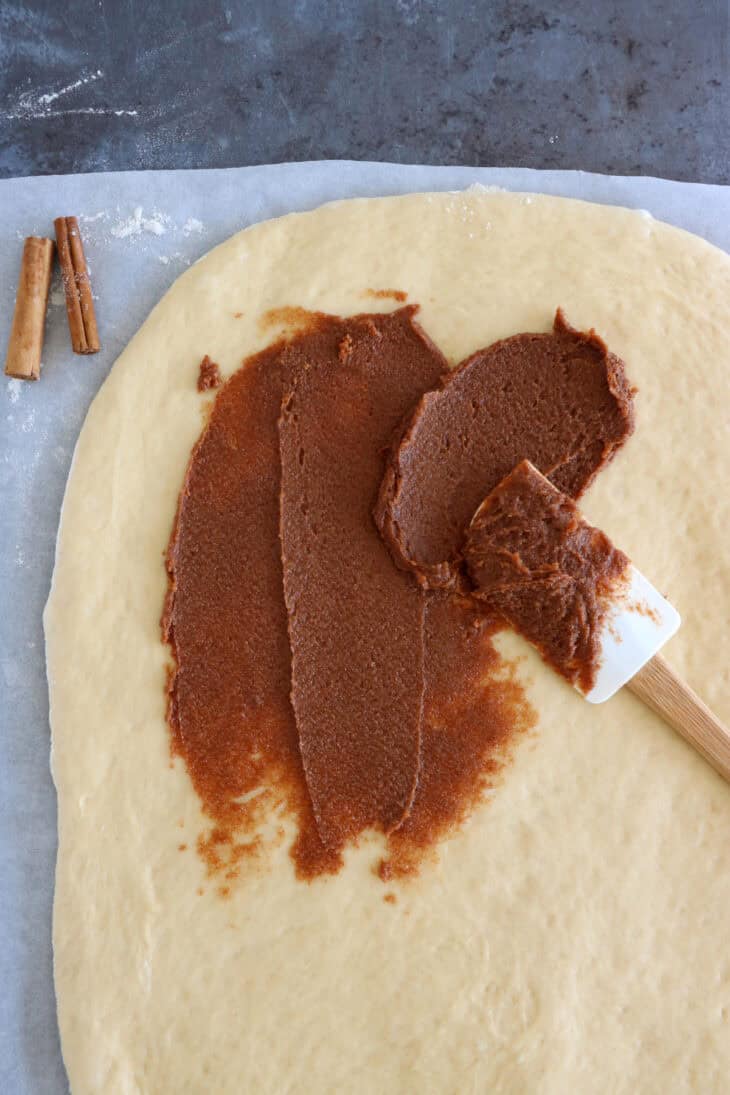 - Répartissez ensuite la garniture à la cannelle par-dessus et enroulez la pâte en un long rouleau en partant du côté le plus long.