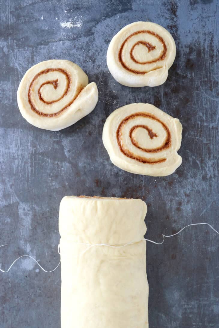 - Coupez en 12 parts égales, en utilisant un grand couteau ou du fil dentaire (qui permet d’éviter aux roulés de s’écraser à la découpe).