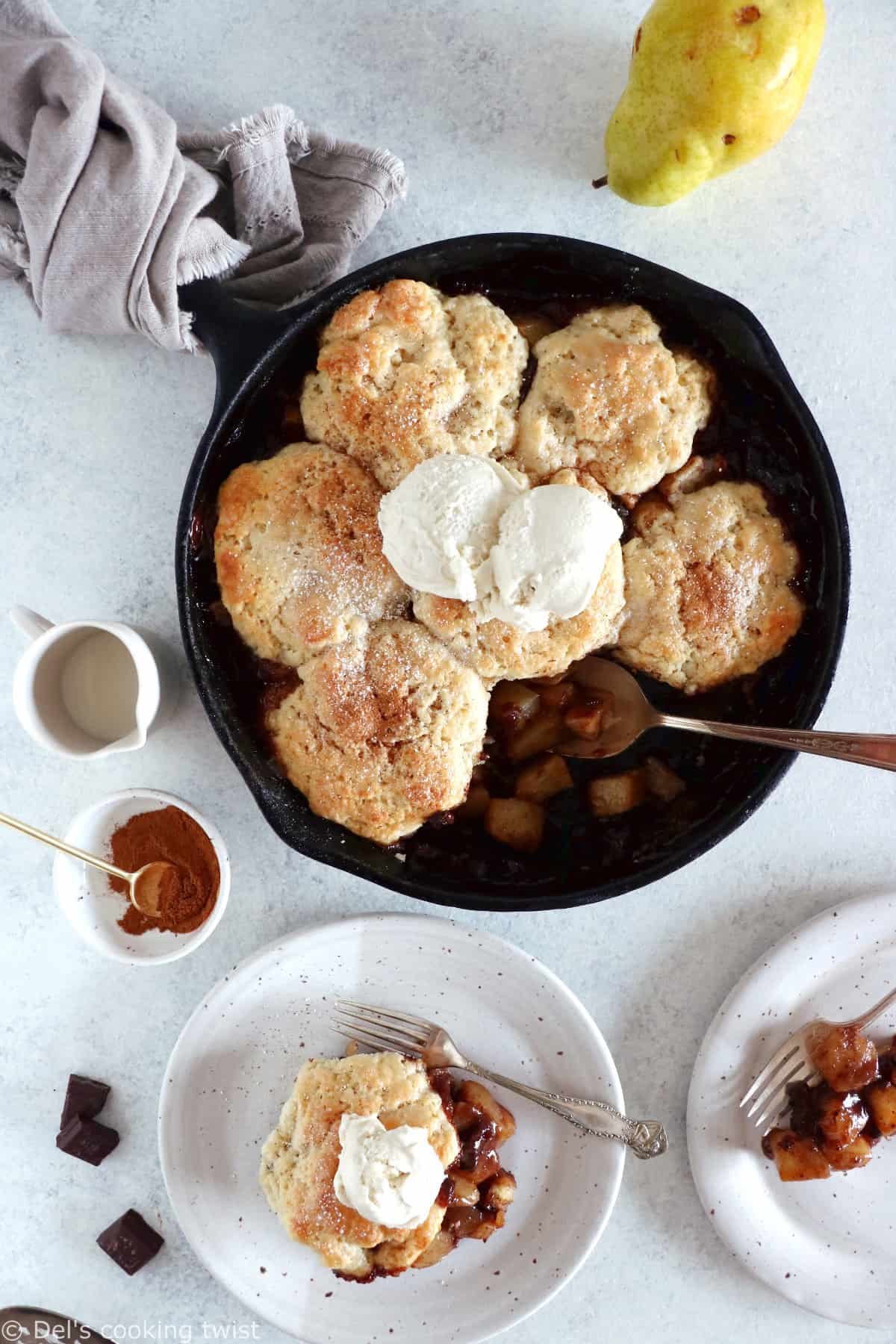 Sans surprise, cette recette de cobbler poires chocolat est donc pour moi la gourmandise ultime. Mais l’idée était aussi de vous donner un peu d’inspiration pour utiliser les poires et le chocolat ensemble dans un autre dessert à la fois original tout en étant ultra simple à réaliser. Pour ceux qui n’arrivent pas à se décider entre un gâteau et une tarte, et qui en outre souhaitent ne pas passer des heures en cuisine, le cobbler est la solution idéale. On y retrouve des poires subtilement épicées à la cannelle, du chocolat noir encore chaud, le tout sous une épaisse couche de biscuits de type scones. Vous n’y résisterez pas !
