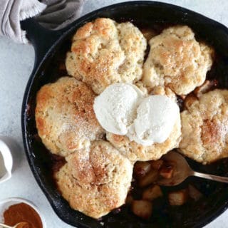 N’oubliez pas de dorer les biscuits ! C’est la petite finition qui change tout et ajoute du croquant aux biscuits. J’utilise ici un peu de buttermilk (lait caillé) que je badigeonne par-dessus la pâte à biscuits avant de saupoudrer de sucre et d’enfourner le tout. Le résultat est parfait : une pâte parfaitement friable et moelleuse à la fois. Servez votre cobbler encore chaud et avec un peu de glace vanille sur le côté.