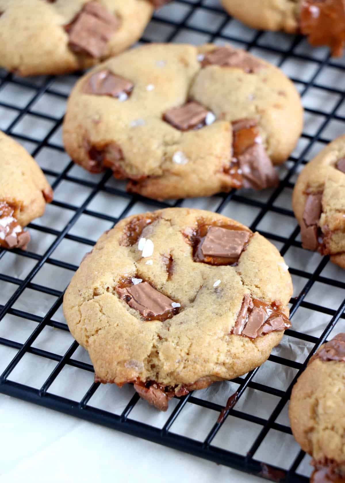 9. Enfourner pendant 8-10 minutes ou jusqu’à ce que les cookies deviennent légèrement dorés tout en étant encore un peu sous-cuits au milieu/à l’intérieur (c’est normal). Retirer du four et parsemer de cristaux de sel de mer. Laisser reposer une minute supplémentaire sur la plaque, puis transférer sur une grille pour laisser refroidir complètement.