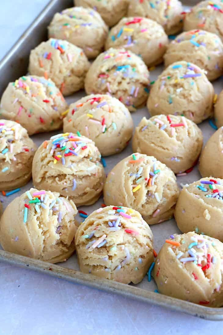 - Placer les boules de cookies sur les plaques, en laissant suffisamment d’espace entre elles pour leur laisser la place de s’étaler à la cuisson. Parsemer de vermicelles multicolores supplémentaires.