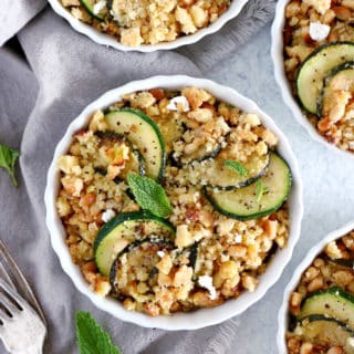 - Répartir la pâte à crumble par-dessus chaque ramequin ou sur les courgettes dans le plat à gratin, puis enfourner pendant 20-25 minutes, ou jusqu’à ce qu’il soit légèrement doré. Déguster chaud ou tiède, en accompagnement d’une salade verte.