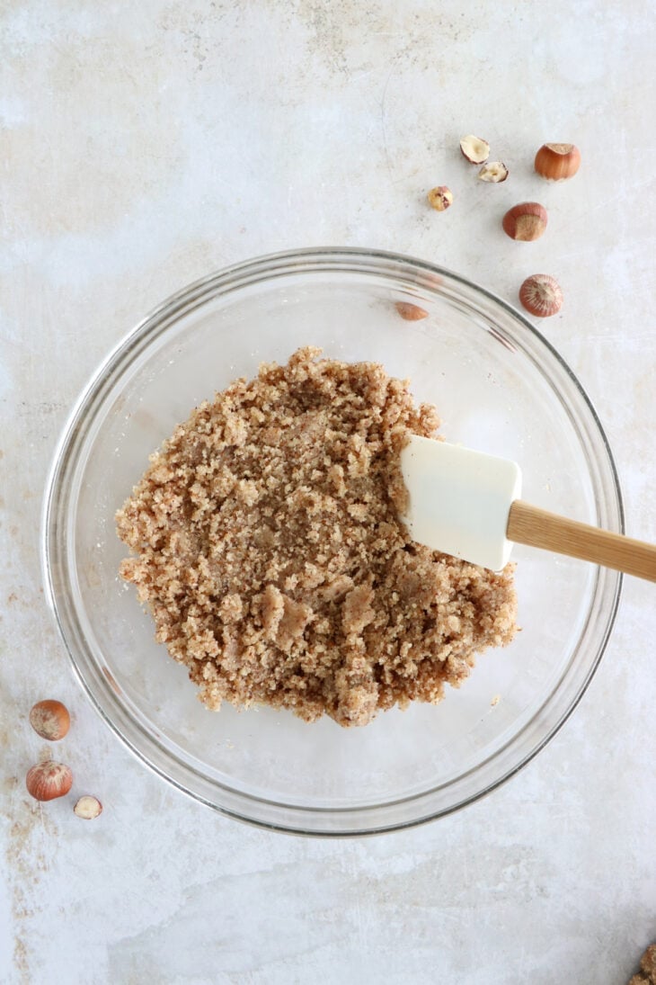 - Dans un grand saladier, mélanger ensemble la poudre de noisettes, la farine et le sucre. Ajouter le beurre fondu et bien mélanger.