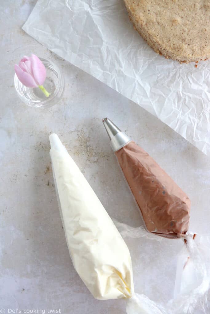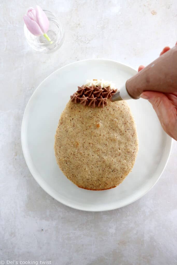 - Transférer chaque ganache dans une poche à douille (l’une avec l’embout en forme d’étoile et l’autre en forme de fleur) et décorer le gâteau à la noisette, en alternant des lignes de ganache au chocolat et de chocolat blanc, comme indiqué sur les photos. Agrémenter de petits oeufs au chocolat pour la finition.