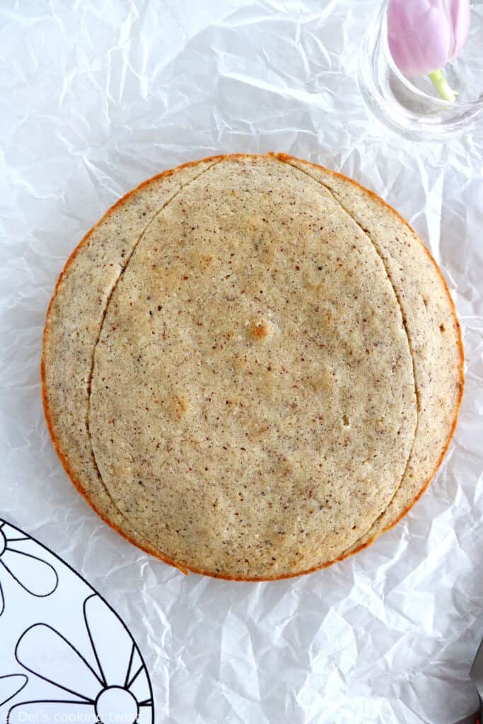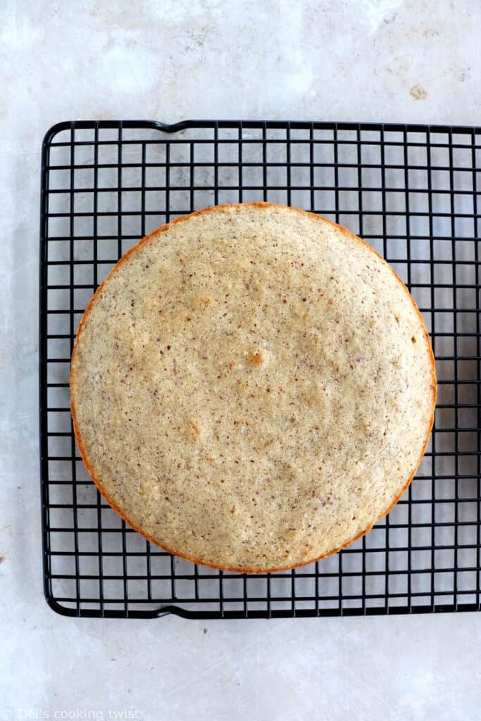 - Farine. Le mélange farine et poudre de noisettes permet au gâteau d’avoir une bon maintien après cuisson – résultat qui ne serait que partiellement possible avec de la poudre de noisettes uniquement.