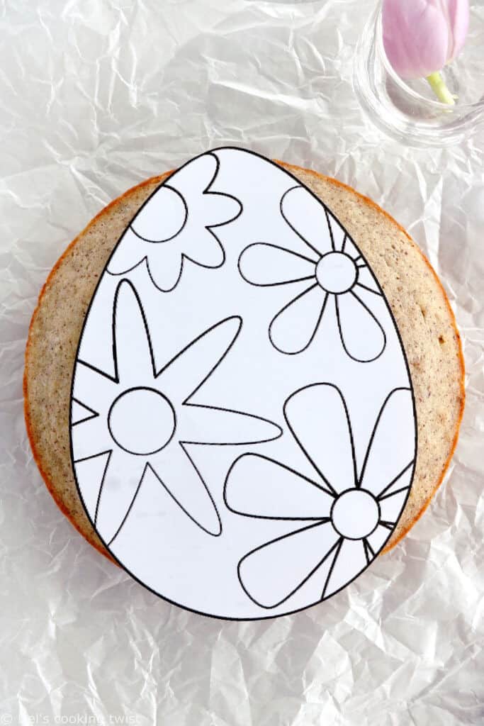 - Laisser le gâteau refroidi 5 minutes dans le moule, puis transférer sur une grille et laisser refroidir à température ambiante. Utiliser un template d’oeuf imprimé sur une feuille A4 en guise de pochoir pour couper un très gros oeuf dans le gâteau, à l’aide d’un large couteau.