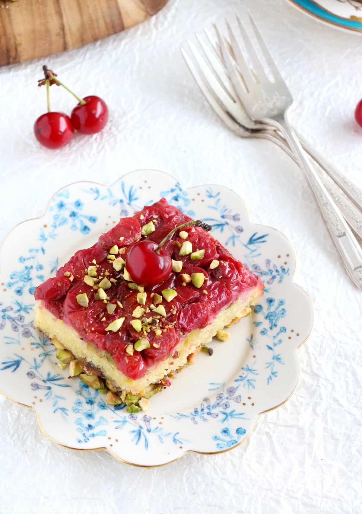 Mon gâteau renversé aux cerises sera juste parfait. J’ai pensé au départ vous partager une recette de clafoutis aux cerises mais il manquait un petit twist et j’avais besoin d’un nouveau défi culinaire. Alors que les amandes sont les amies de toujours des cerises, on pense beaucoup plus rarement à associer les cerises avec des pistaches. Or, vous serez heureux d’apprendre que cerises et pistaches font très bon ménage, tandis que le contraste de leurs texture rend un ensemble des plus harmonieux. J’ai donc ici simplement réalisé une pâte de gâteau classique, avec du beurre salé, du rhum et de la vanille (il est des classiques qu’il ne faut pas se refuser) !